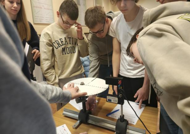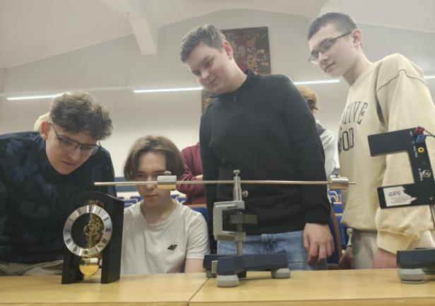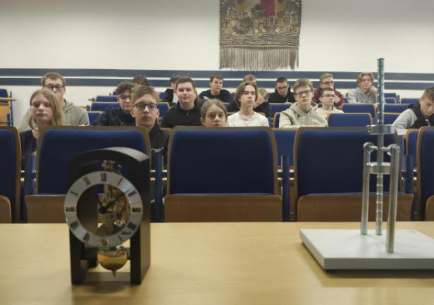 Na spotkaniu akademickim z fizyki pt. "Jak mierzymy czas? Fizyka zegarów mechanicznych, wahadłowych i z balansem skrętnym" uczniowie poznali historię zegarów mechanicznych, fizyczne podstawy ich działania i sposoby pomiaru czasu. W trakcie wykładu omówiono rolę układów drgających – wahadeł i balansów – które przez stulecia stanowiły podstawę dokładnych mechanizmów zegarowych. Zwrócono uwagę na zależność okresu drgań od długości wahadła, znaczenie grawitacji oraz ograniczenia, jakie prawa fizyki stawiają w dążeniu do coraz większej precyzji pomiaru czasu. W części warsztatowo-laboratoryjnej uczestnicy samodzielnie przeprowadzali pomiary okresu drgań wahadeł matematycznych, na podstawie których wyznaczali wartość przyspieszenia ziemskiego. Zajmowali się również analizą drgań wahadeł skrętnych, wykorzystując je do wyznaczania momentów bezwładności wybranych układów.