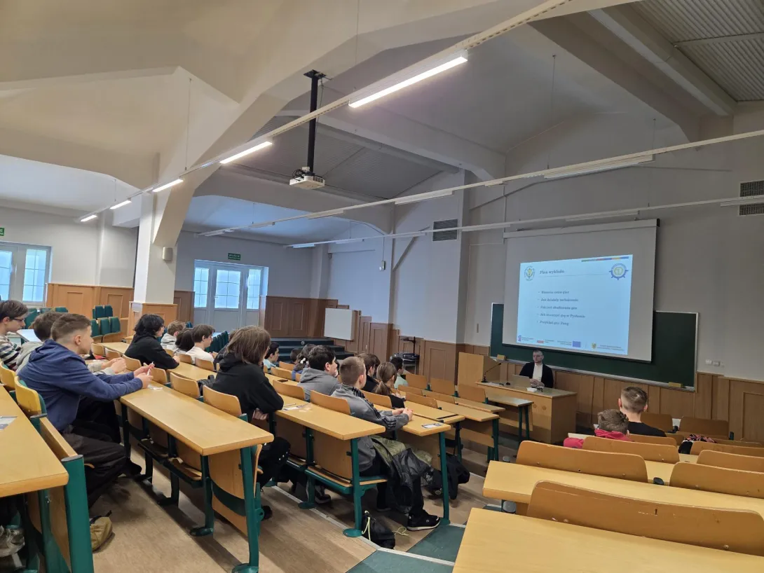 W czasie trwania spotkania na wykładzie uczniowie poznali podstawy tworzenia gier komputerowych poprzez nawiązanie do klasycznych, retro produkcji. Uczestnicy poznali historię gier wideo oraz wyjaśniono im, jak proste mechaniki wpłynęły na rozwój współczesnych gier. Prezentacja wykładowa miała też na celu rozwinąć logiczne myślenie, kreatywność oraz umiejętności programistyczne w języku Python. W części teoretycznej uczestnicy poznali także podstawowe pojęcia związane z tworzeniem gier, takie jak pętla gry, zdarzenia, kolizje czy grafika 2D. Uczniowie zapoznali się także z biblioteką Pygame. Na ćwiczeniach laboratoryjnych uczniowie mieli możliwość poznać konstrukcję i zasady stosowania języka programowania Python. Następnie uczniowie krok po kroku tworzyli jedną z pierwszych gier w historii – Ponga. Uczestnicy samodzielnie zaimplementowali mechanikę gry, obsługę klawiatury, poruszanie się obiektów oraz zliczanie punktów. Praca odbywała się pod opieką prowadzącego, który na bieżąco wyjaśnia działanie kodu.