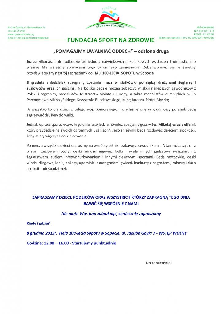 W dniu 8 grudnia br. Fundacja Sport na Zdrowie organizować będzie w Sopocie mecz siatkówki pomiędzy drużynami żeglarzy i żużlowców. Na boisku będzie można zobaczyć w akcji najlepszych zawodników z Polski i zagranicy, medalistów Mistrzostw Świata i Europy, a także medalistów olimpijskich m. in Przemysława Miarczyńskiego, Krzysztofa Buczkowskiego, Kubę Jarosza, Piotra Myszkę. A wszystko to dla dzieci z całego woj. pomorskiego. To właśnie one w grudniowy poranek będą zagrzewać drużyny do walki.