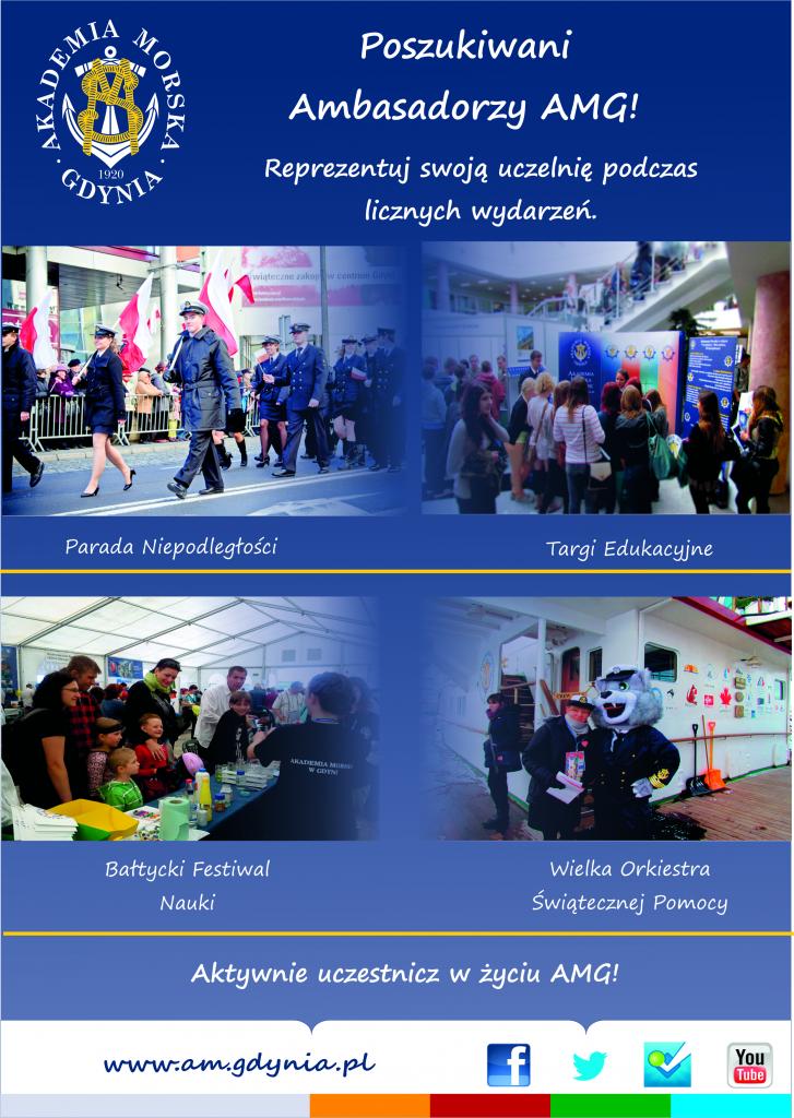 Biuro Promocji AMG poszukuje, chętnych do współpracy, studentów Akademii Morskiej w Gdyni, którzy chcieliby zostać "Ambasadorami AMG" i reprezentować naszą Uczelnię podczas wielu prestiżowych wydarzeń na terenie całej Polski. Więcej informacji znajduje się na stronie Biura Promocji w zakładce "Dzieje się".