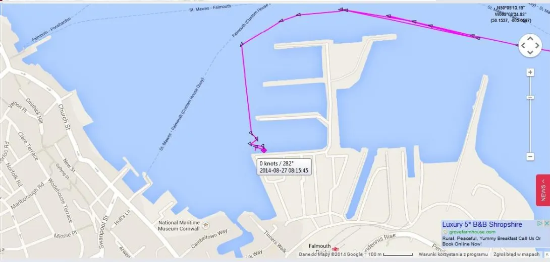 Do Falmouth wchodzimy 27/08 rano - pilot o 0700 LT. Na razie prognozy pogody na regaty są jeszcze mało wiarygodne, ale niestety niezbyt korzystne - słabe zmienne wiatry. W takich warunkach wygrywać będą nie żaglowce, a ich przeliczniki. W niedzielę na starcie nie pojawią się nasi najwięksi rywale Mir, Siedov i Kruzenstern. Będziemy współzawodniczyć z mniejszymi jednostkami. Załoga i praktykanci muszą być przygotowani na dużo pracy przy żaglach - częste brasowanie, trymowanie żagli, zwroty. O zwycięstwo będzie bardzo trudno, ale będziemy walczyć.