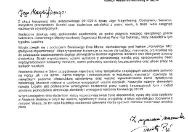Wśród gości, którzy, jak każdego roku, licznie przybyli na uczelnianą uroczystość z kraju i zagranicy, byli przedstawiciele władz państwowych i samorządowych, rektorzy pomorskich uczelni, przedstawiciele przedsiębiorstw gospodarki morskiej, stowarzyszeń współpracujących z Akademią Morską, a także absolwenci i sympatycy uczelni. W inauguracji uczestniczyła grupa 20 stypendystów Ministerstwa Rybołówstwa Angoli. Po powitaniu zebranych rektor AMG prof. dr hab. Piotr Jędrzejowicz w przemówieniu inauguracyjnym skierowanym do studentów nawiązał do historii uczelni, przedstawił jej działalność, osiągnięcia i plany. Nowo przyjętym studentom życzył sukcesów i satysfakcji z wyboru takiej Uczelni, jaką jest Akademia Morska w Gdyni.