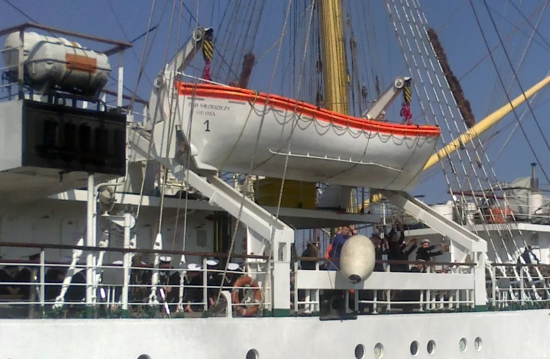 Jak zwykle wypłynięcie "Daru Młodzieży" zgromadziło na Nabrzeżu Pomorskim liczną grupę żegnających - krewnych załogi i praktykantów oraz turystów. Ustawieni w paradzie burtowej umundurowani uczniowie pożegnali Gdynię wesołą meksykańską falą.