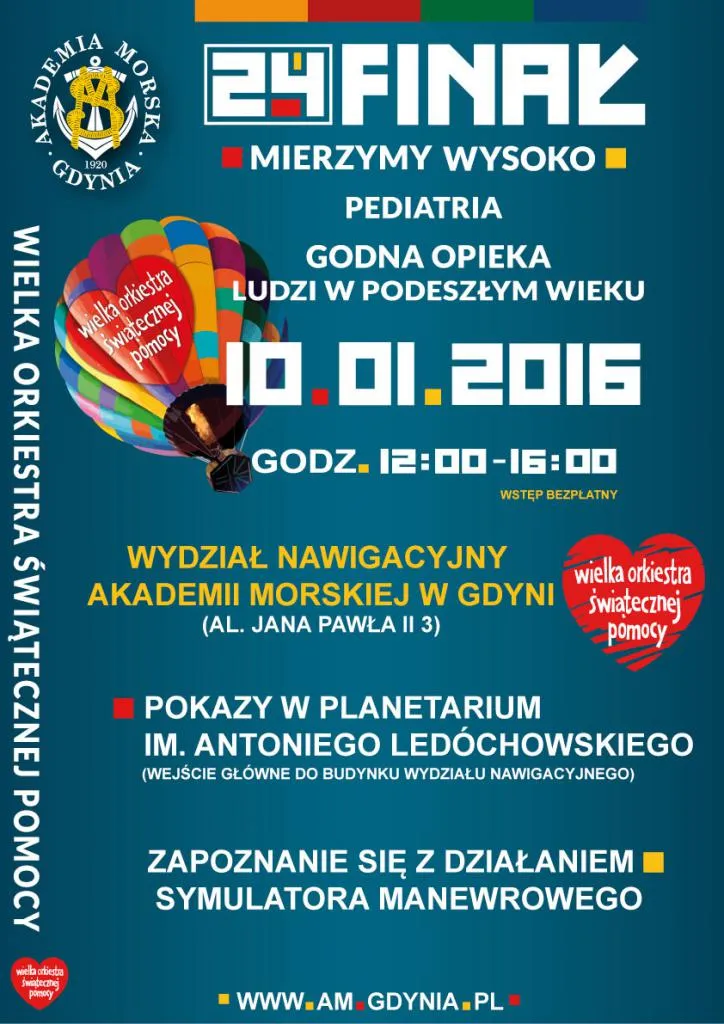 Akademia Morska w Gdyni zagra podczas 24. Finału Wielkiej Orkiestry Świątecznej Pomocy. 10 stycznia 2016 roku w godz. 12:00 -16:00 mierzymy wysoko! Zbieramy na zakup urządzeń medycznych dla oddziałów pediatrycznych oraz dla zapewnienia godnej opieki medycznej seniorów.