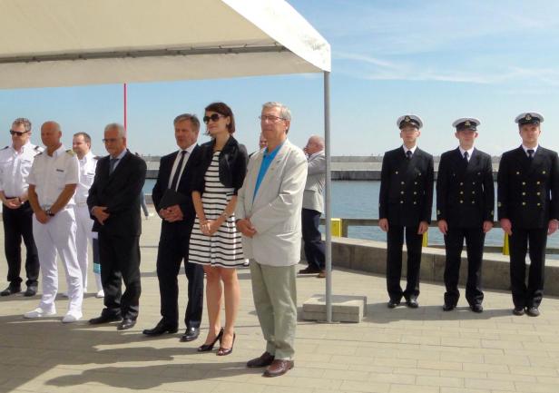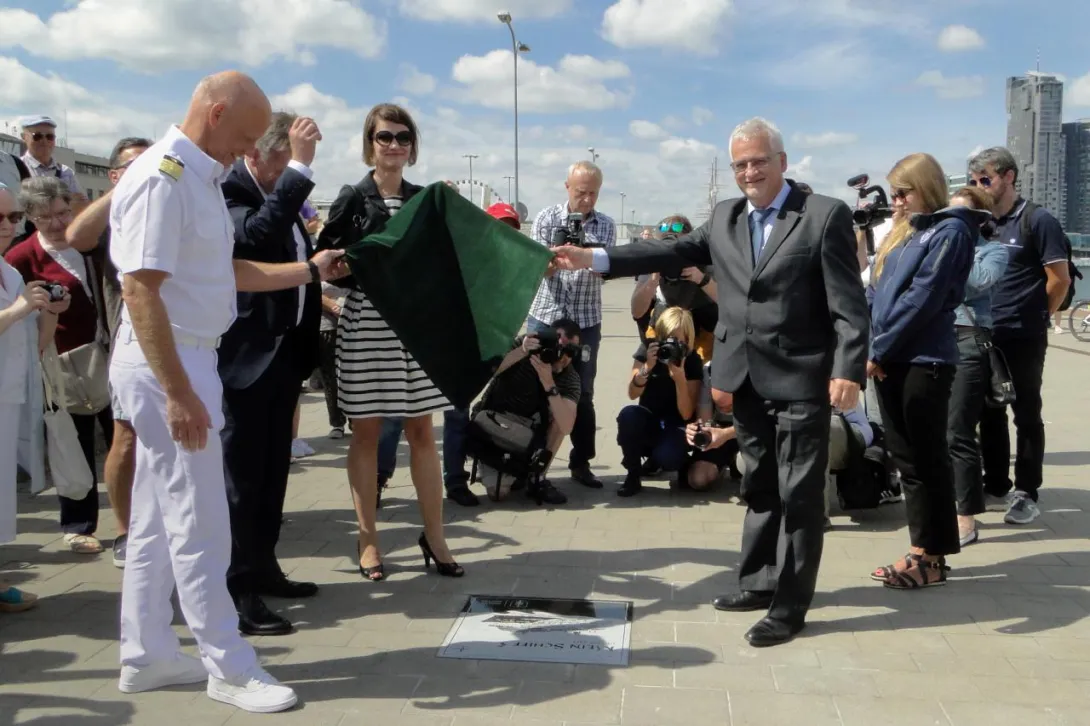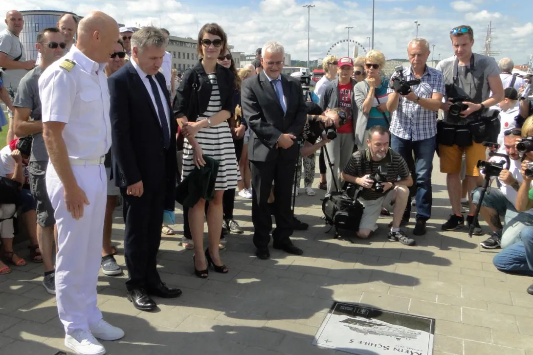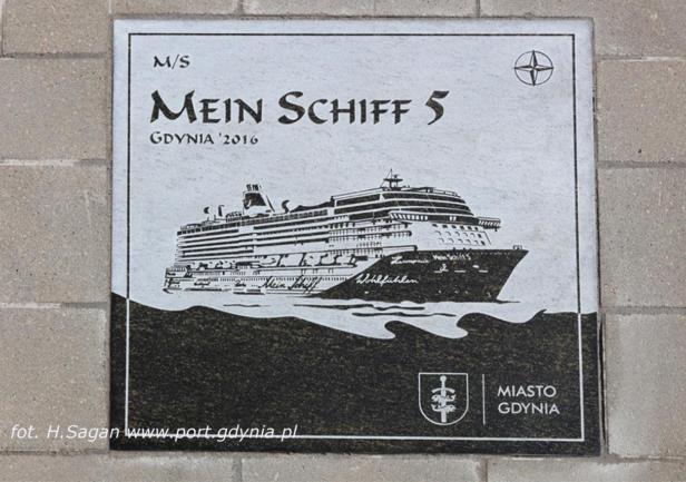 Tego samego dnia, w samo południe, w Alei Statków Pasażerskich odsłonięto kolejną tablicę - wycieczkowca "Mein Schiff 5", który zawinął do Gdyni w dziewiczej podróży. W tradycyjnej ceremonii wzięła udział wiceprezydent Gdyni pani Katarzyna Spychała-Gruszecka, kapitan statku Todd Burgman oraz nowy prezes Zarządu Morskiego Portu Gdynia  Adam Meller. W kilkuosobowej delegacji załogi "Mein Schiff 5" znalazł się także nasz absolwent Michał Sadowski, pełniący funkcję III oficera. W przeszłości kilkakrotnie wchodził w sk  ład załogi "Daru Młodzieży" - jako instruktor, a ostatnio jako II oficer. Zadeklarował, że jak w przyszłym roku zawinie ponownie do Gdyni, już na "Mein Schiff 6", postara się zapewnić kilku studentom AMG zwiedzenie statku.