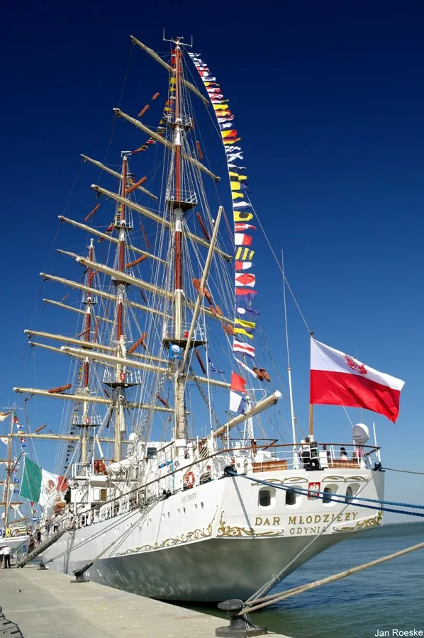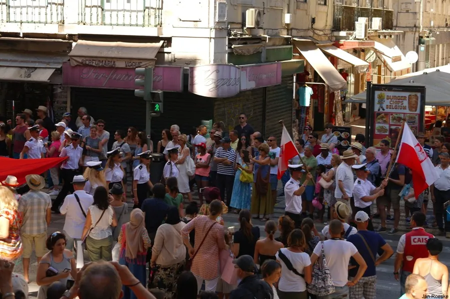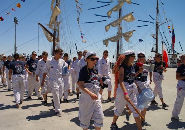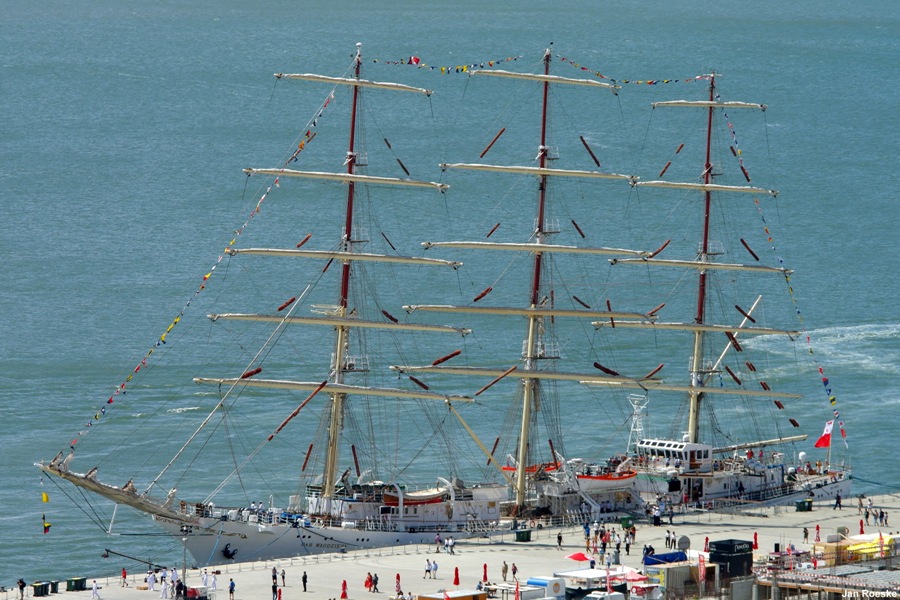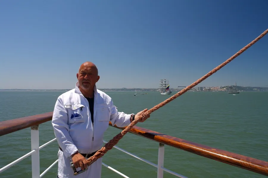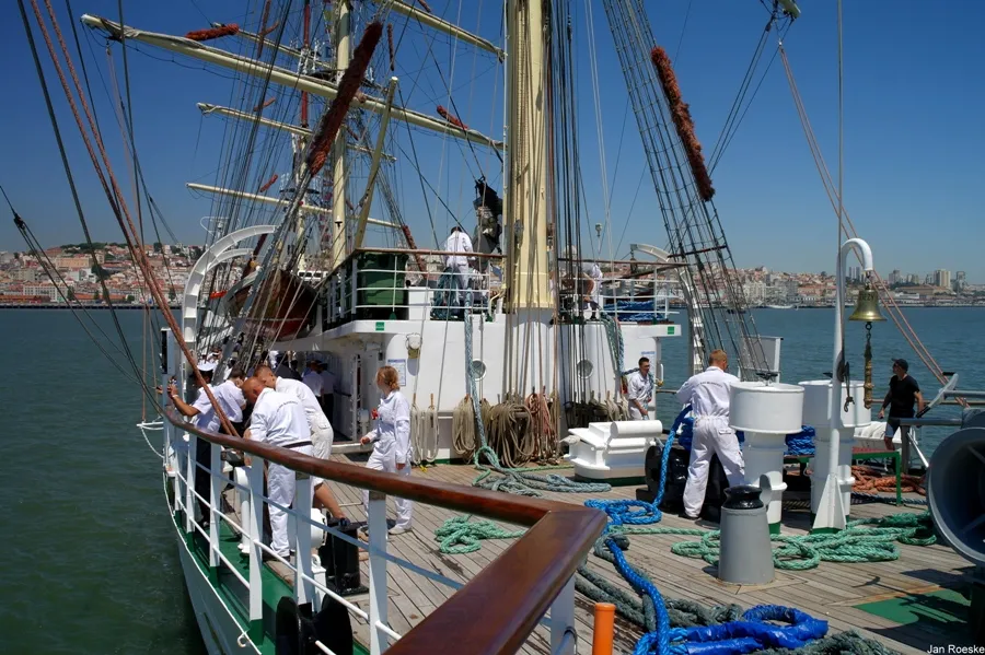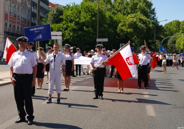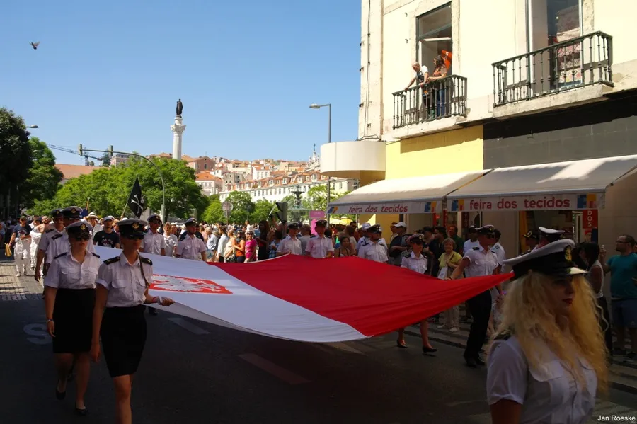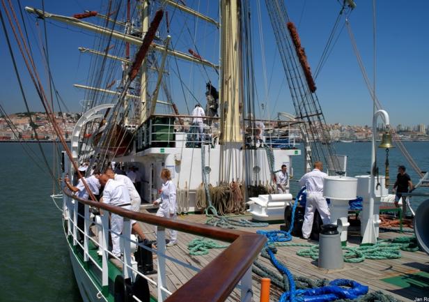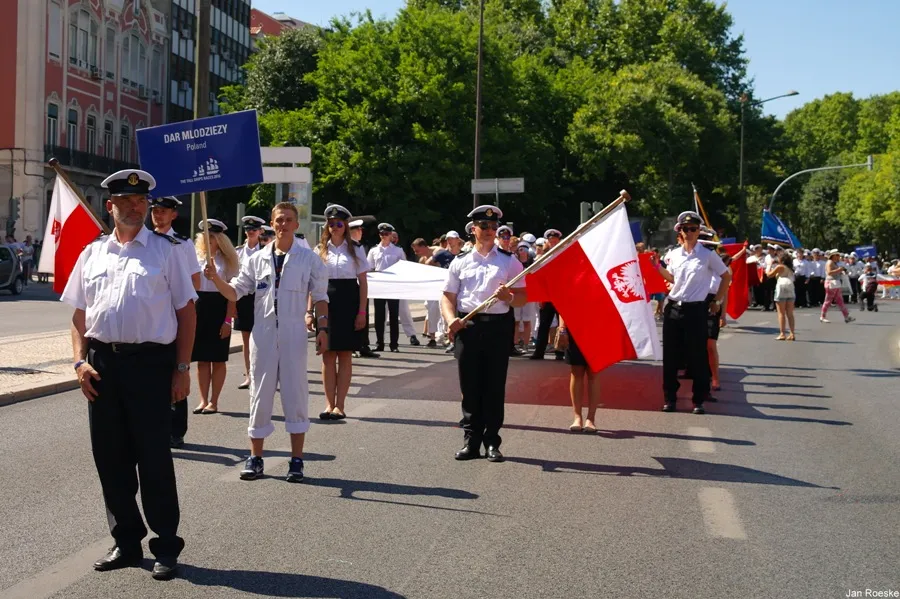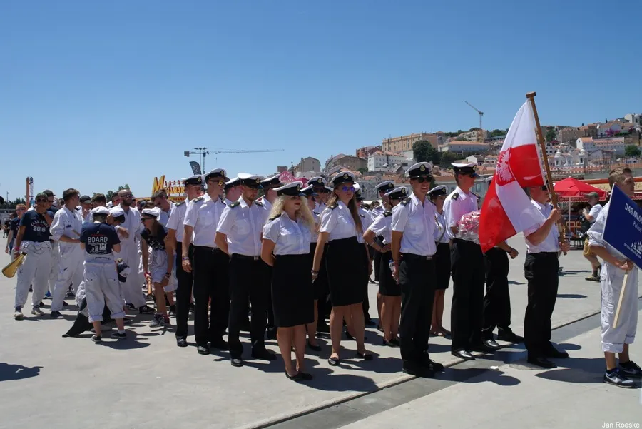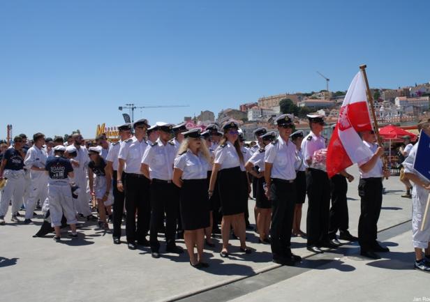 Lizbona przywitała nas bardzo ciepło. Zarówno jeśli idzie o temperaturę powietrza jak i temperaturę relacji międzyludzkich. Kolorowy tłum przywitał flotyllę żaglowców, na której czele przybył między innymi „Dar Młodzieży”. Podczas postoju wprawdzie nie mogliśmy się równać, pod względem obfitości zdobień statków i mundurów, także talentów muzycznych załóg, z żaglowcami krajów latynoamerykańskich, jednak wszyscy odwiedzający, a codziennie tysiące przechodziły przez nasz pokład, zwracali uwagę na porządek, czystość i stan techniczny naszego żaglowca. Pod tym względem, rzeczywiście pozytywnie się wyróżnialiśmy. Zaskoczyliśmy również naszym udziałem w paradzie załóg. Otóż część reprezentujących nas studentów, jak zwykle wystąpiła w nienagannych mundurach, reszta natomiast poprzebierana, wyposażona w tuby i bębny, stanowiła barwny korowód wypełniający śpiewem ulice Lizbony. Udział w regatach i imprezach The Tall Ship Races zaowocował mnóstwem międzynarodowych, żeglarskich przyjaźni. Szczególne więzi nawiązaliśmy z meksykańskim żaglowcem „ Cuauhtemoc” i norweskim „Statsraad Lehmkuhl” oraz co oczywiste – z polskimi żaglowcami „Fryderyk Chopin” i” Pogoria”.
