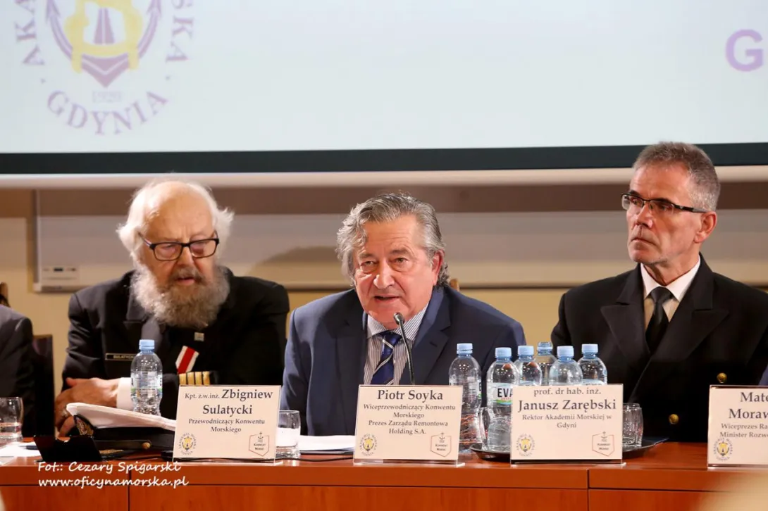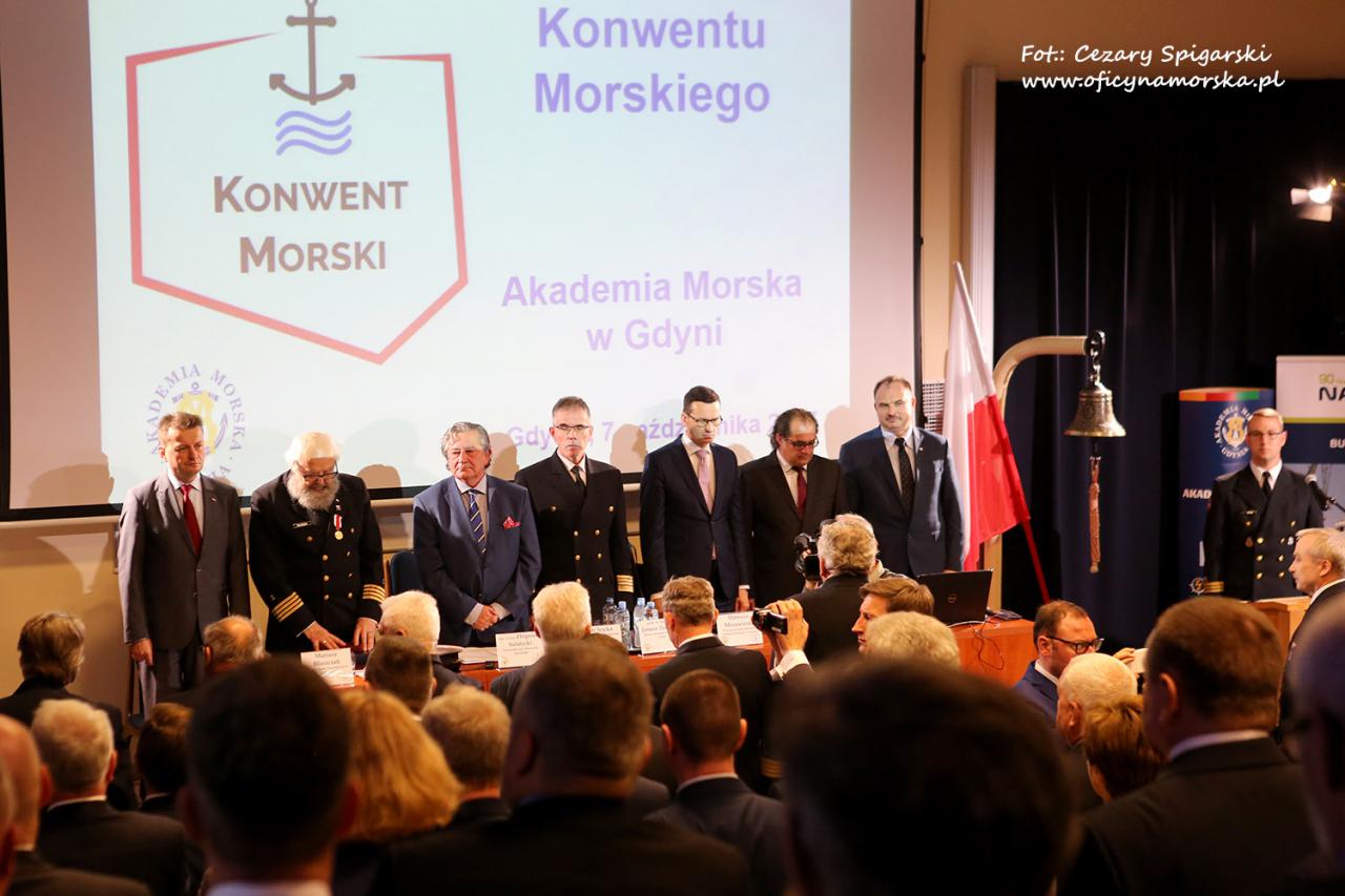 W sobotę 7 października, w dniu inauguracji roku akademickiego, w budynku Wydziału Nawigacyjnego AMG obyło się czwarte już posiedzenie Konwentu Morskiego. To nieformalne, społeczne ciało skupiające grono fachowców z wielu dziedzin gospodarki morskiej, powstałe z inicjatywy kpt.ż.w. Zbigniewa Sulatyckiego, stawia sobie za cel podniesienie spraw polskiego morza do rządowych priorytetów. Wpływy animatorów Konwentu sprawiły, że tegoroczna inauguracja i późniejsze posiedzenie zgromadziły znaczące osobistości. Obradom Konwentu przewodniczył prezes Remontowa Holding S.A. Piotra Soyka, w prezydium zasiedli m.in. wicepremier Mateusz Morawiecki, ministrowie Mariusz Błaszczak i Marek Gróbarczyk, rektor AMG prof.dr hab. inż. Janusz Zarębski. Na sali m.in. minister w Kancelarii Prezydenta RP Adam Kwiatkowski, wiceministrowie rządu Anna Moskwa (MGMiŻŚ), Jan Dziedziczak (MSZ), Bartosz Kownacki (MON), Kazimierz Smoliński (MIiB)szefowa Komisji Morskiej Sejmu RP Dorota Arciszewska-Mielewczyk, wojewoda pomorski Dariusz Drelich, prezydent Gdyni Wojciech Szczurek. Liczni przedstawiciele kadr kierowniczych najważniejszych firm Pomorza, placówek naukowych, administracji morskiej.