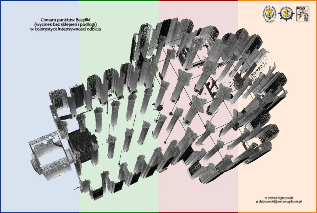 Dziesiątki gigabajtów danych połączono w oprogramowaniu Trimble RealWorks w spójną całość. W rezultacie uzyskano niezwykle bogaty zbiór danych przestrzennych (geo-danych) dotyczących wnętrza monumentalnej Bazyliki. Otrzymana chmura punktów będzie przedmiotem prac i analiz badawczych Katedry w dziedzinie skaningu laserowego.