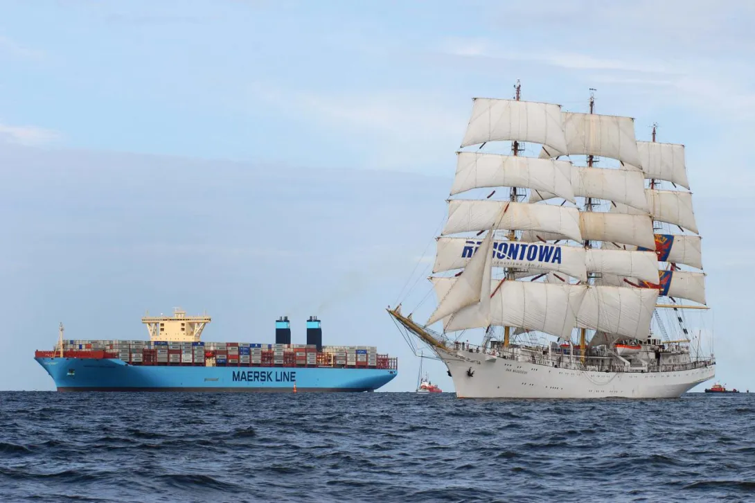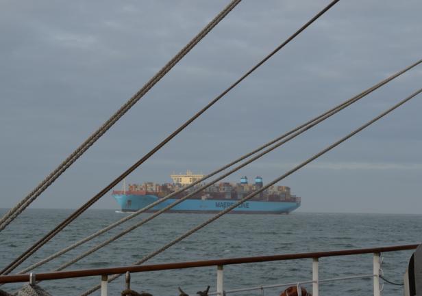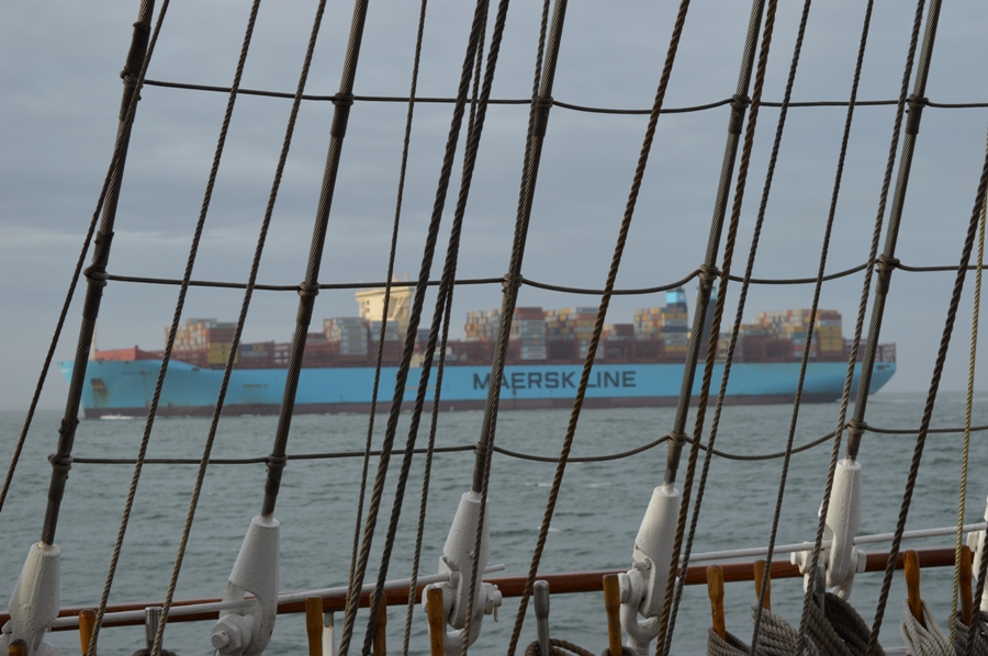 W rejonie Skagen (północny cypel Jutlandii), portu na którego redzie "Dar Młodzieży" uzupełniał paliwo, doszło do spotkania z oceanicznym gigantem - jednym z wielkich statków klasy Triple E duńskiego armatora Maersk Line - światowego potentata na rynku operatorów kontenerowych.
