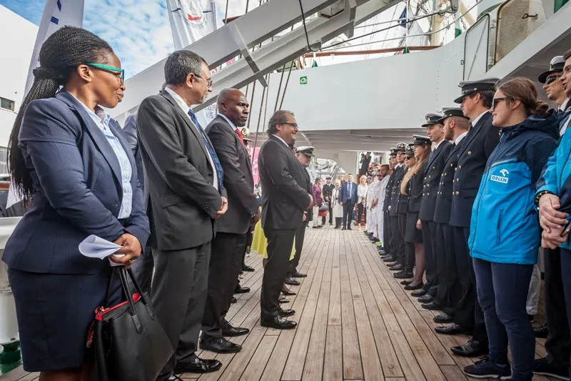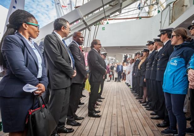 18.07. - przed nami pierwszy port afrykański – Dakar – stolica Senegalu. Przed wejściem do portu praktykanci przygotowali fregatę do wizyty. Przez kilka dni klarowali żagle, myli pokłady, malowali nadbudówki i burty, polerowali mosiądze. W Dakarze powitała nas orkiestra wojskowa i pani Ambasador RP w Senegalu. Zaraz po odprawach praktykanci wyruszyli "w miasto". Mieszkańcy Dakaru okazali się życzliwi i przyjaźnie nastawieni . Po południu na pokładzie „Daru” przyjęcie na pokładzie z udziałem ambasadorów dziewięciu państw.