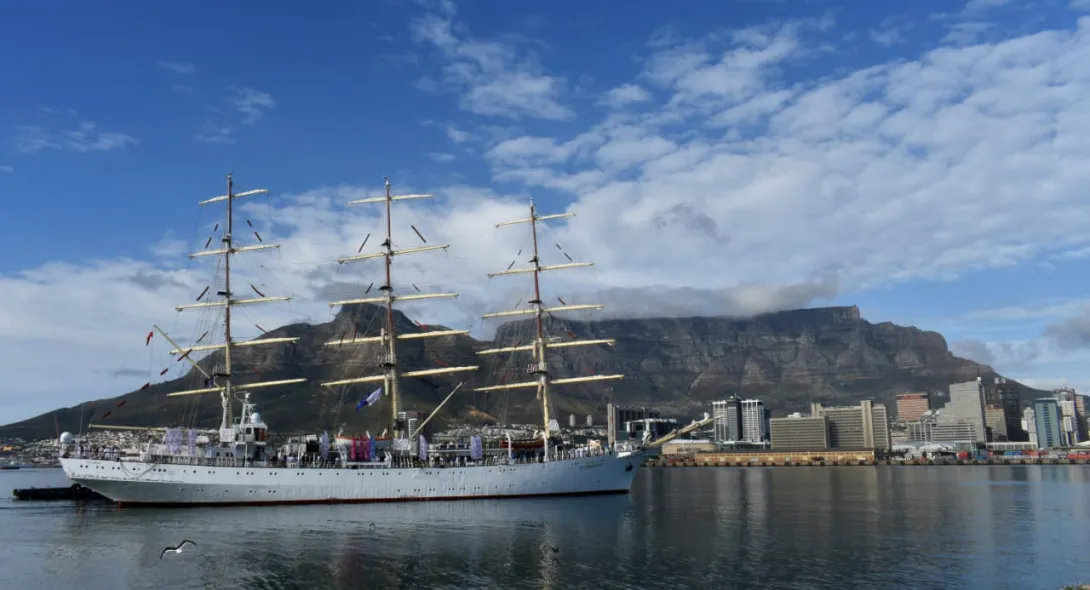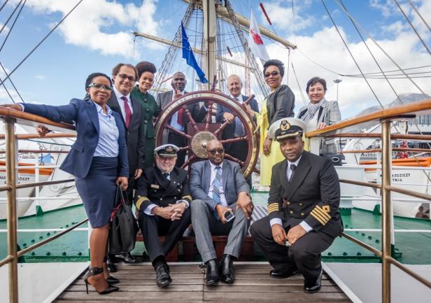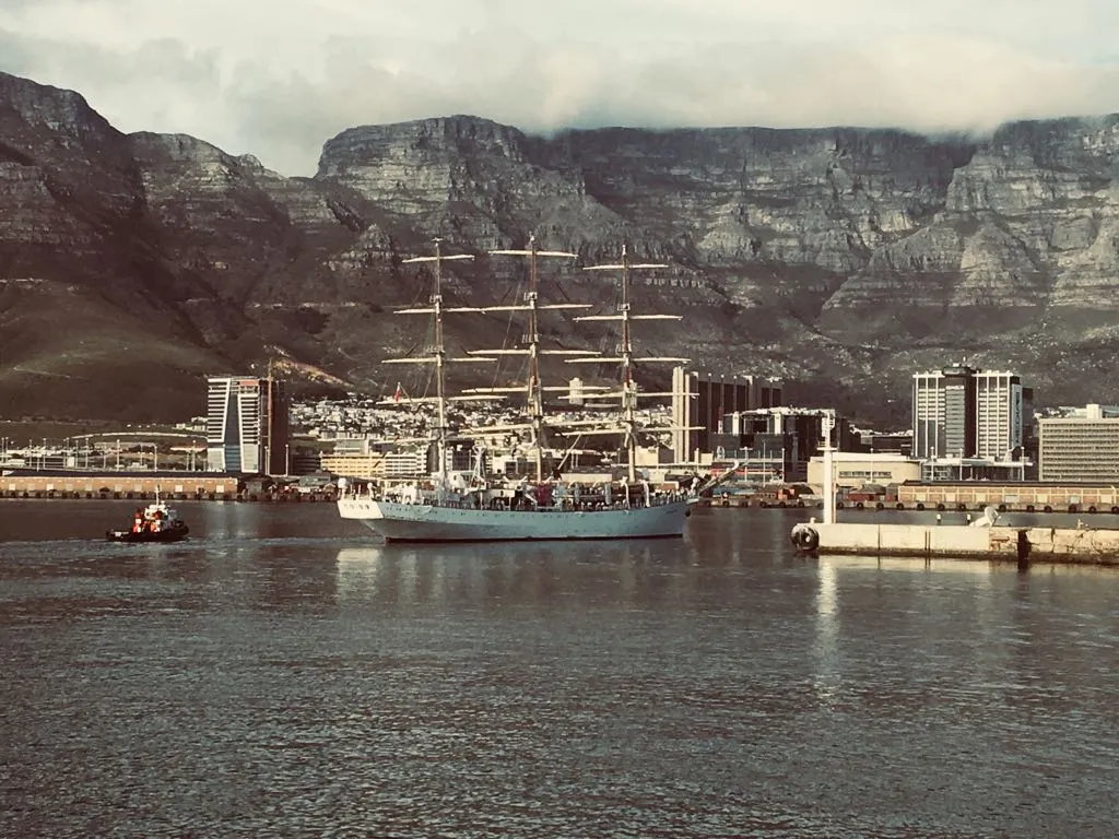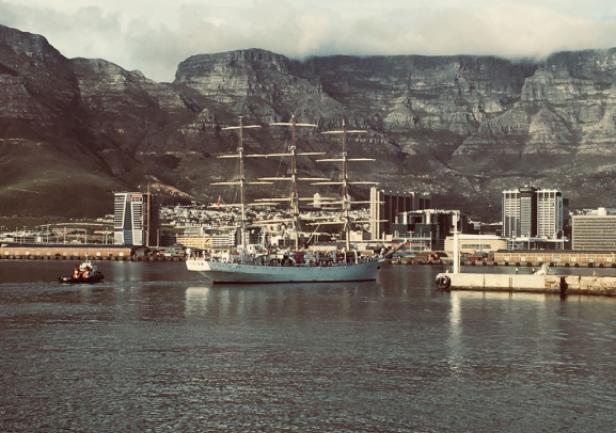 15.08. - Kapsztad powitał nas pięknym słońcem i widokiem Góry Stołowej przykrytej malowniczym obrusem z chmur. Na powitanie wyszedł nam holownik wyposażony w dwie armatki wodne, z których sikał na wiwat wprowadzając nas z honorami do portu. Splendoru dodała jeszcze orkiestra wojskowa, grająca melodię łudząco podobną do ścieżki dźwiękowej z "Pingwinów na Madagaskarze". Wśród witających znajdował się Minister gospodarki morskiej i żeglugi śródlądowej Marek Gróbarczyk i ambasador RP w Pretorii Andrzej Kanthak. Podczas postoju studenci i laureaci konkursu zwiedzali miasto, a także odwiedzili statek szkolny należący do szkoły technicznej w Kapsztadzie. Miasto zgodnie uznaliśmy za przepiękne, na co największy wpływ ma malownicze położenie: pomiędzy Górą Stołową, Lwią Głową i Wzgórzem Sygnałowym. Miejsce postoju "Daru" również należało do malowniczych. Była to prestiżowa dzielnica miasta - Waterfront, stanowiąca luksusową zabudowę dawnych terenów portowych.