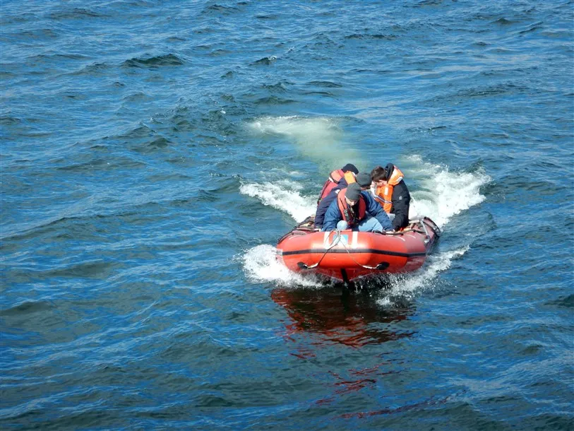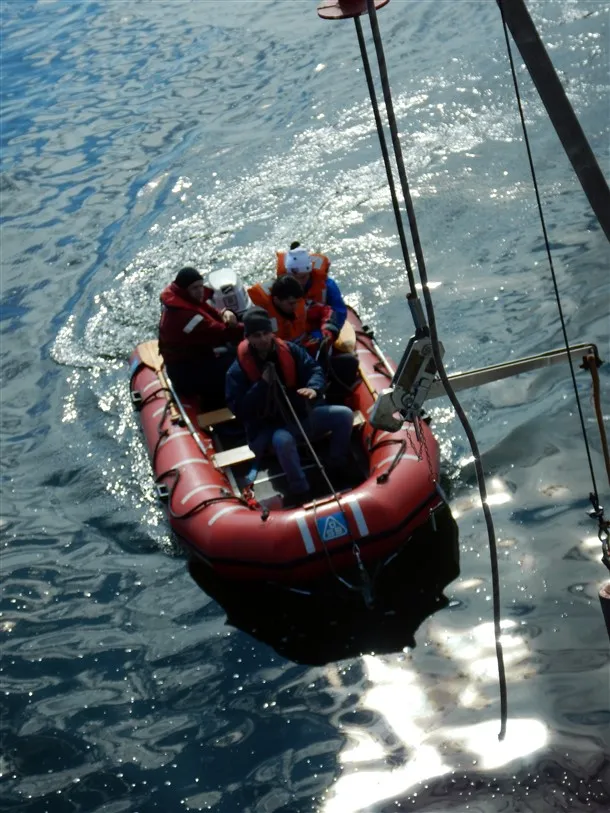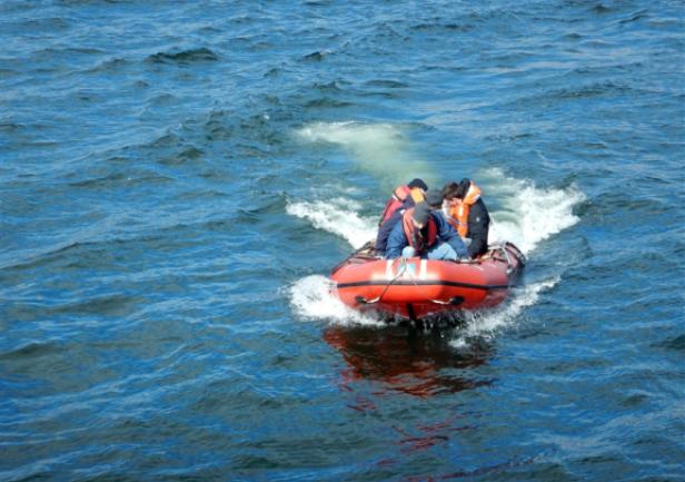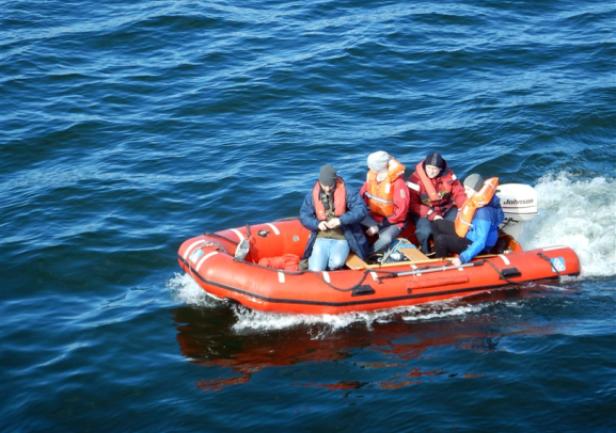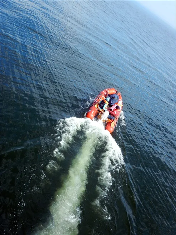 10. Łódż ratownicza (RIB) na wodę i po pechowca! Przy problemach z łodzią jeden młody, wysportowany, w kombinezonie ratunkowym i na długiej lince schodzi po sztormtrapie i płynie te 15-30 m do człowieka.