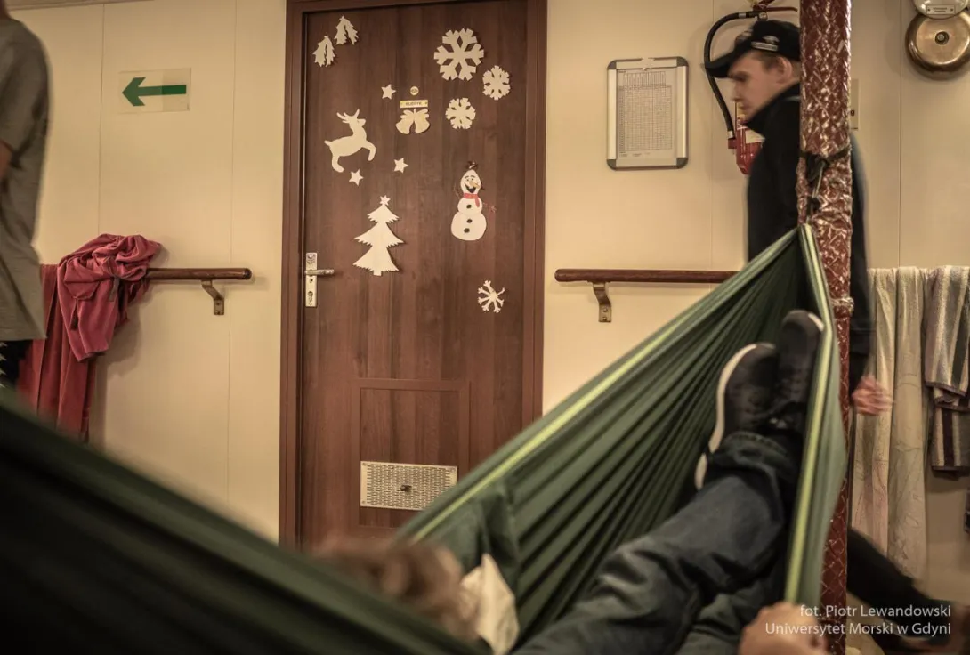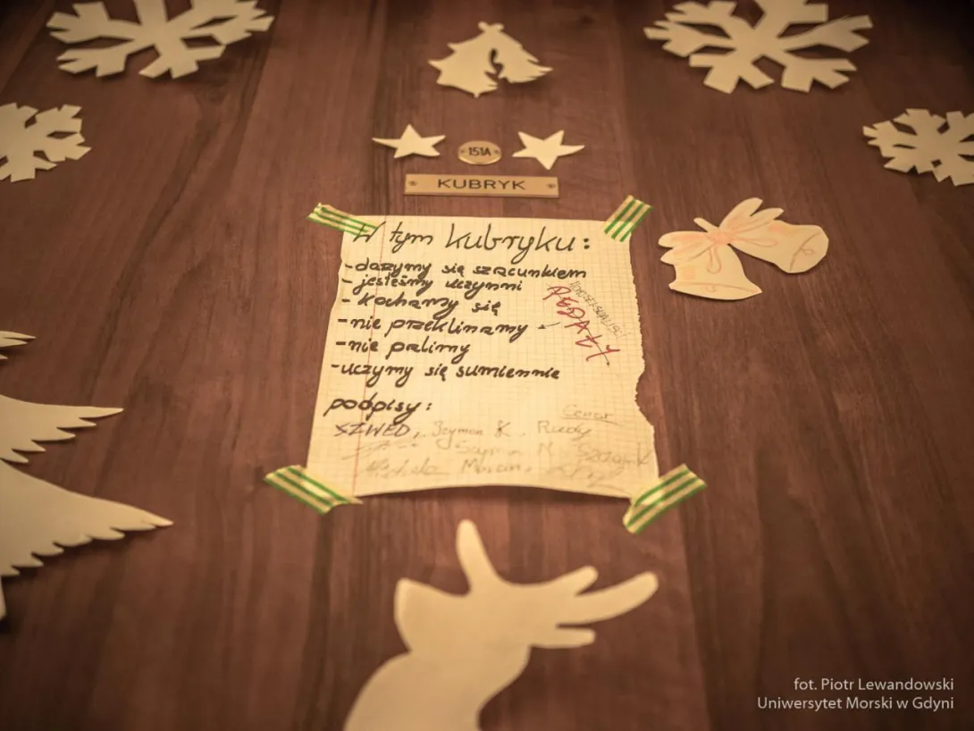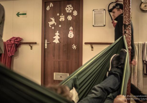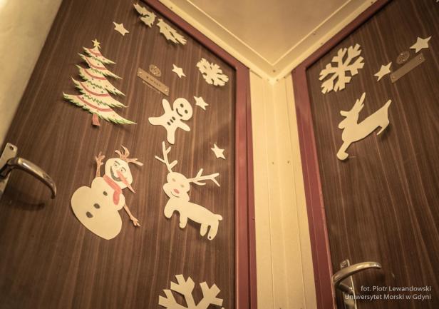 Szóstego grudnia to także dzień świętego Mikołaja. Nie obyło się bez niespodzianek. Rano zastałem na moich drzwiach przepiękne ręcznie wycinane papierowe ozdoby. Złośliwiec jeden (czyli ja sam) powiedział że to wizytówka – „tu mieszka bałwan i jeleń”, ale sprawcy twierdzą, ze jest w błędzie. Okazało się że wiele innych drzwi zostało podobnie ozdobione. Na podniesieniu bandery Mikołajki wręczyły wybrańcom piękne ręcznie robione skarpety wypchane łakociami. Teraz w różnych zakamarkach statku ruszyła nielegalna produkcja łańcuchów na choinki które mamy dostać w San Francisco - bosman pilnuje łańcuchów kotwicznych ;-), bo jest konkurs na najdłuższy