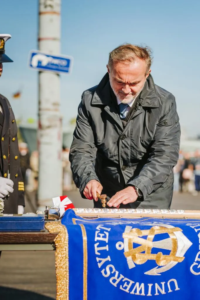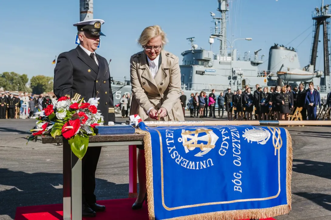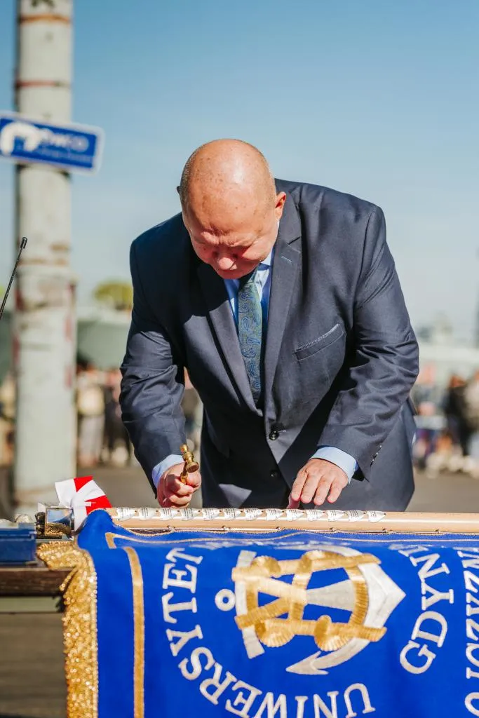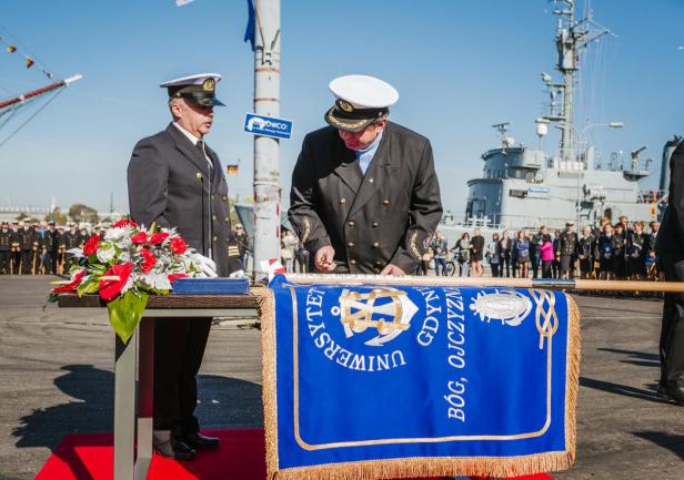 Po przemówieniu inauguracyjnym JM Rektora nastąpiło odczytanie aktu nadania sztandaru i uroczyste przekazanie nowego sztandaru dla Uniwersytetu Morskiego w Gdyni. Akt nadania, w imieniu Ministra Gospodarki Morskiej i Żeglugi Śródlądowej Pana Marka Gróbarczyka, odczytała Pani Minister Anna Moskwa. Następnie, zgodnie z XVIII-wiecznym obyczajem, wyróżnieni goście dokonali wbicia pamiątkowego gwoździa oraz potwierdzili ten fakt złożeniem podpisu w Księdze Pamiątkowej. Uroczystego wręczenia sztandaru na ręce Rektora Uniwersytetu Morskiego w Gdyni prof. Janusza Zarębskiego, dokonał Dyrektor Urzędu Morskiego w Gdyni Pan kpt. ż. w. Wiesław Piotrzkowski w towarzystwie Wiceminister Gospodarki Morskiej i Żeglugi Śródlądowej Pani Anny Moskwy oraz przewodniczącej Komisji Gospodarki Morskiej i Żeglugi Śródlądowej Pani Poseł Doroty Arciszewskiej-Mielewczyk.