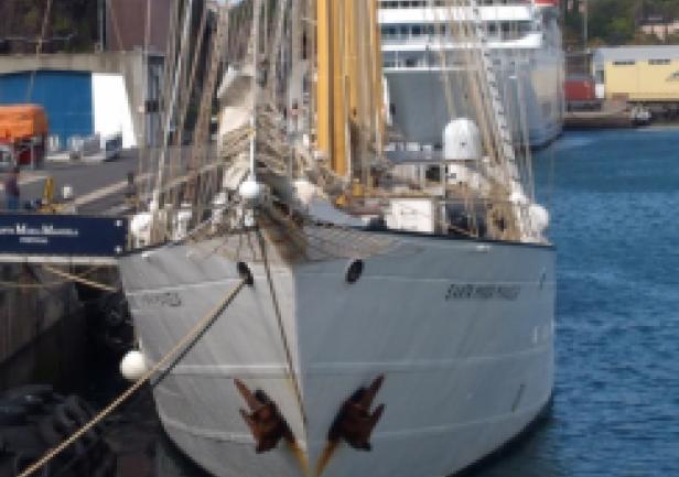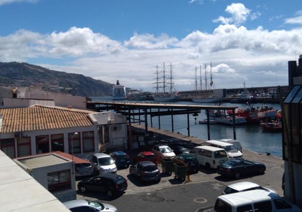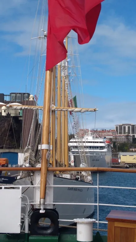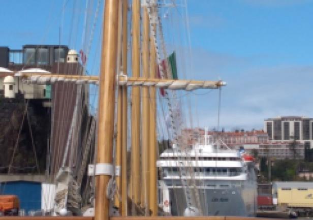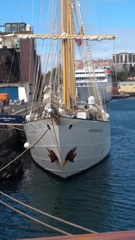 "Dar Młodzieży" zameldował się w Funchal 6 kwietnia o godz. 7.19 czasu lokalnego (6.19 UTC). Za rufą naszego żaglowca cumuje piękny, zabytkowy 4-masztowy szkuner portugalski "Santa Maria Manuela". Zbudowany w 1937 roku jako statek rybacki, w 2010 roku gruntownie zrewitalizowany, jest częstym gościem zlotów żaglowców. Podziwialiśmy go podczas rocznicowego zlotu Operacja Żagle Gdyni 2014, w sierpniu ubiegłego roku odwiedził Szczecin w ramach The Tall Ships Races. Komendant Lewandowski, w piątkowe popołudnie, gościł na "Darze" zaprzyjaźnionego komendanta portugalskiej "Marii Manueli".