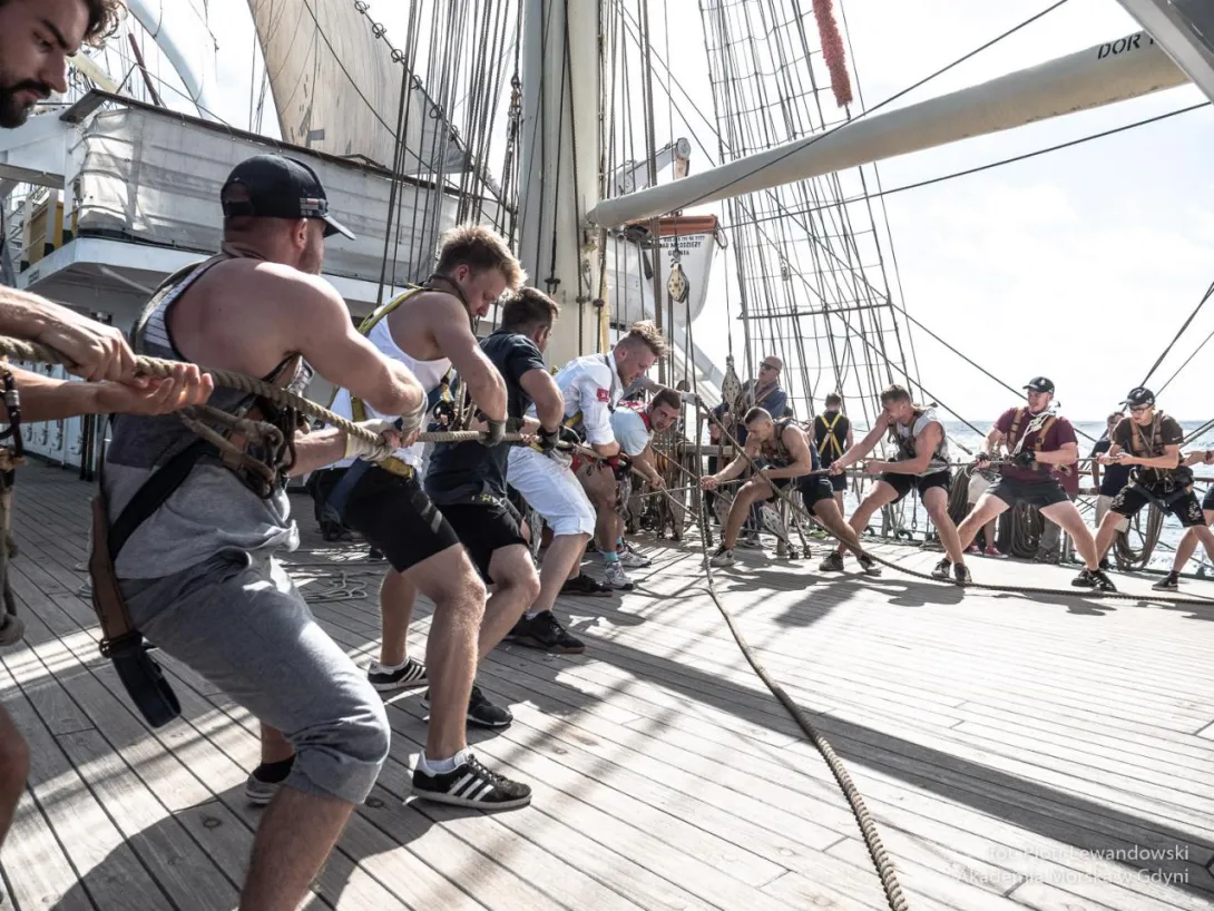 "Dar" długo czekał na taki moment. Postawiliśmy WSZYSTKIE żagle (26). Nasi praktykanci robili taką operacje po raz pierwszy i jak na nowicjuszy, mimo upału, spisali się rewelacyjnie. Najpierw postawiono "trójkąty", następnie kolejne żagle rejowe. "Dar" rósł żaglami "do nieba". Nie pamiętam w jakiej kolejności Balzac wymieniał najpiękniejsze rzeczy, ale dla mnie fregata pod pełnymi żaglami zawsze jest przed baletnicą w tańcu i koniem w galopie. Zrobiliśmy płynny zwrot przez rufę, a kamery uwieczniły statek na tle zachodzącego słońca.