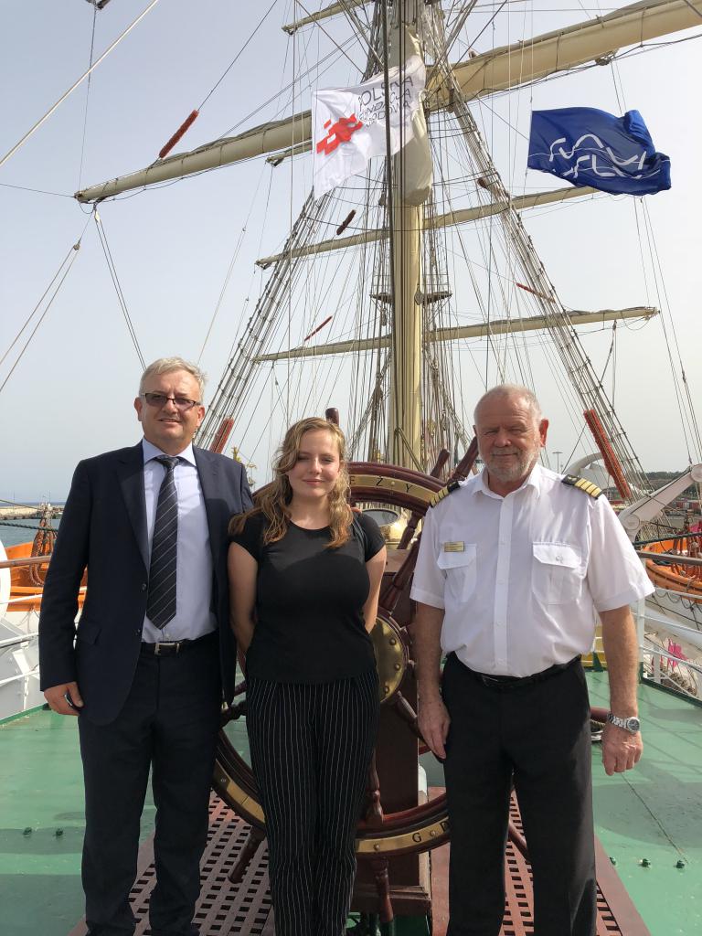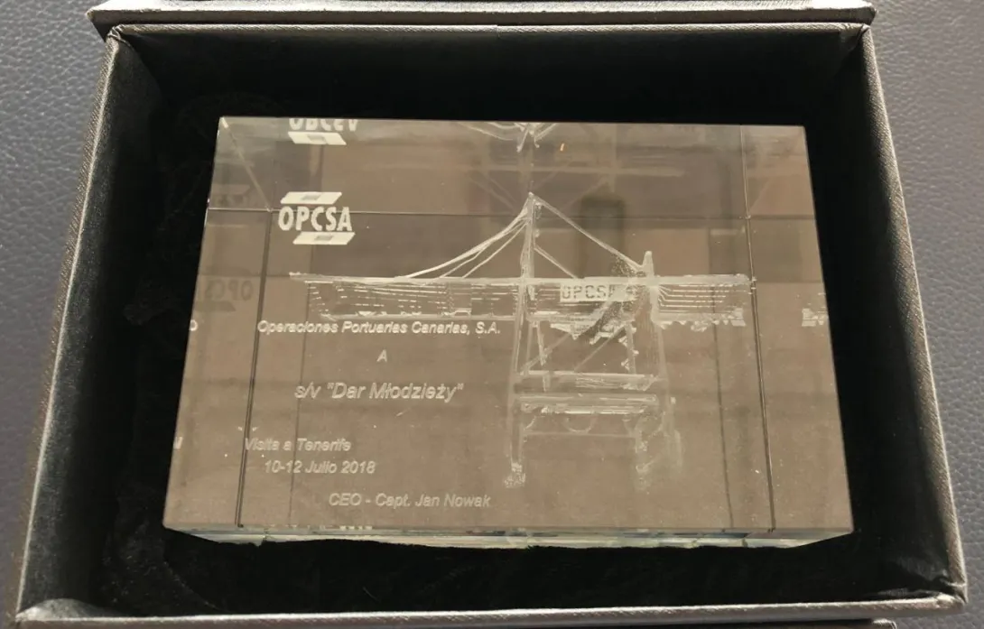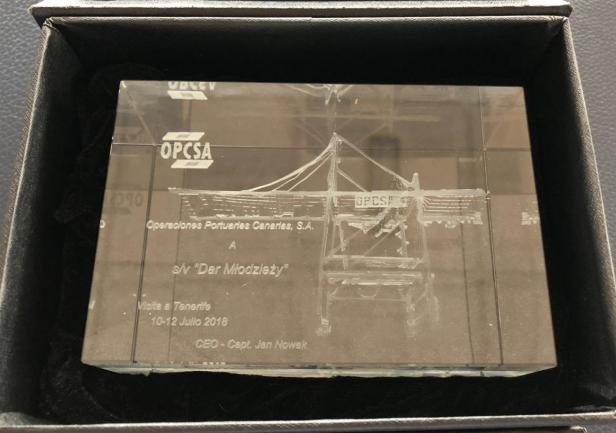 Tyle kapitan Jan Nowak - absolwent WSM z 1988 roku. W środę, 11 lipca, odwiedził w Santa Cruz "Dar Młodzieży" z córką i prezentem. Jak będziecie w Las Palmas pamiętajcie, że CEO (Chief Executive Officer) na terminalu OPCS S.A. jest nasz człowiek na Kanarach. Serdeczne pozdrowienia z Gdyni,