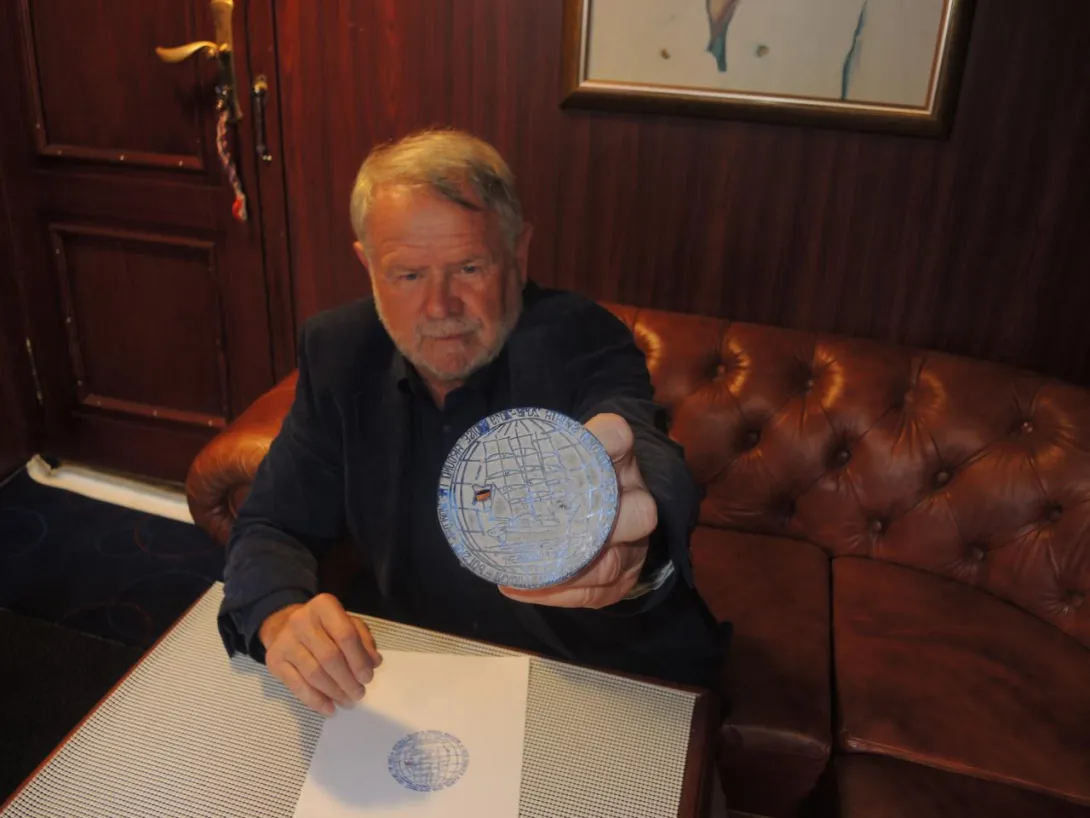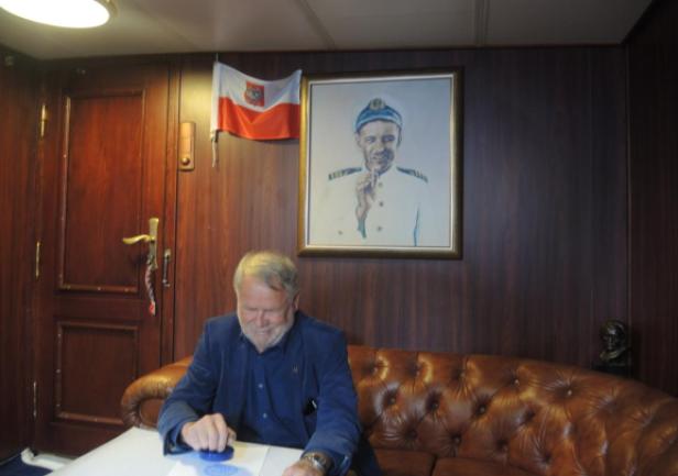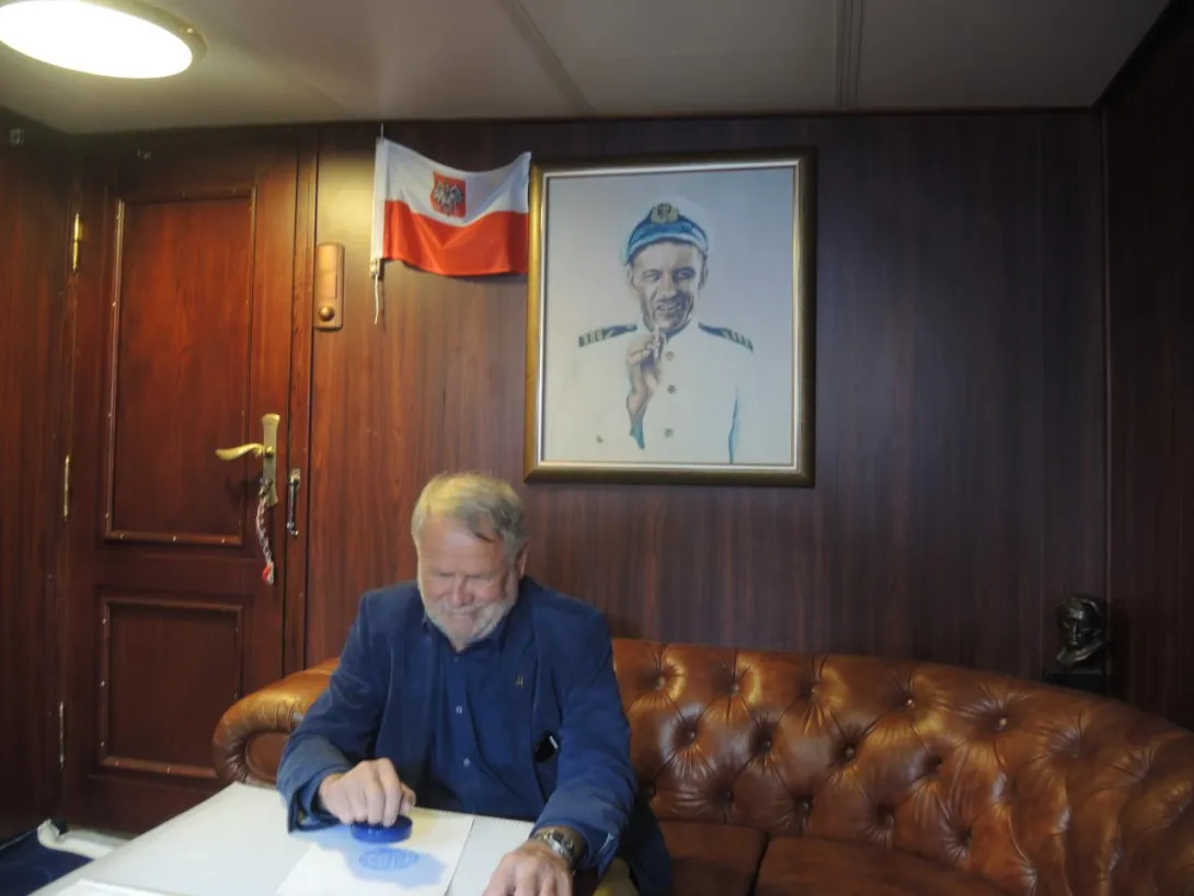 Opowieść komendanta: "...jakoś wczesnym popołudniem dotarł na pokład przemiły pan. Nauczyciel gdzieś spod Koszalina. W tym rejwachu zapomniałem jak się nazywa i dokładnie z jakiej miejscowości przyjechał. Mam nadzieję, że mi wybaczy. Przywiózł dla mnie i statku prezent - własnoręcznie wykonany pamiątkowy, oryginalny, dwukolorowy stempel - "Dar Młodzieży" pod żaglami i biało-czerwoną banderą. Zaprasza nas, po powrocie, do swojej szkoły na spotkanie z młodzieżą. Obiecałem, że dojadę. Dziękuję za prezent."