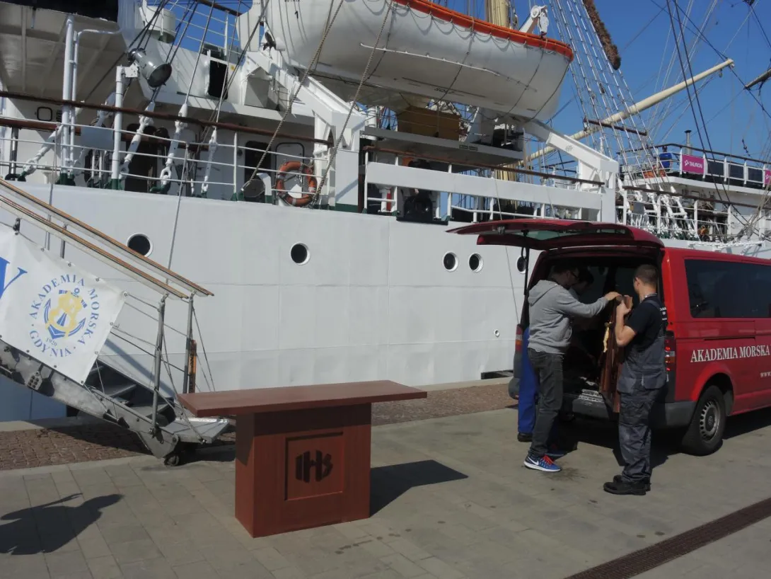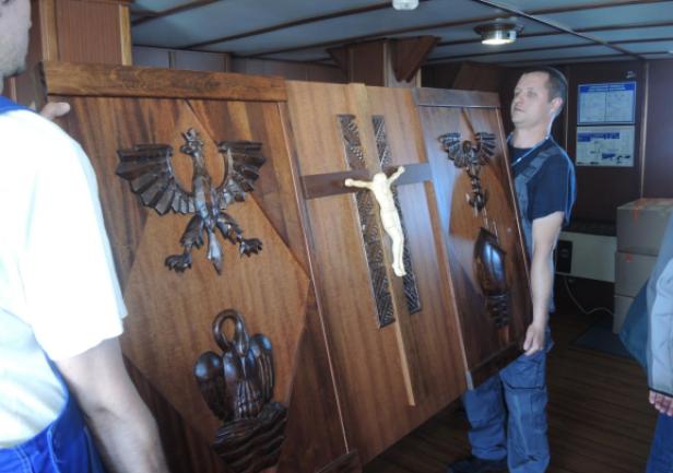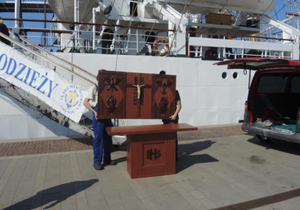 Obserwacja spod trapu: z furgonetki AMG wyłonił się niecodzienny ładunek. Monogram IHS i wszystko jasne - to mensa i nastawa ołtarza polowego, przy którym odprawiona zostanie w dniu wyjścia "Daru" msza święta. Ołtarz wyjątkowy - ufundowany na "Dar Pomorza" - od 1930 stanowił wyposażenie "białej fregaty". Wraz z wybitnym kapelanem ks. Wojciechem Kossak Główczewskim opłynął świat w latach 1934/1935, był na Hornie w 1937 roku. Po wojnie w 1949 roku skazany na zniszczenie, dzięki dzielnym ludziom ocalony, czas PRL-u przetrwał, w piwnicy na opał, prywatnym mieszkaniu, później w kościele pw. Świętej Rodziny na Grabówku. Zwrócony po zmianie ustroju Szkole, przekazany został następnie Centralnemu Muzeum Morskiemu - wrócił na pierwotne miejsce, do międzypokładu "Daru Pomorza". Na polecenie ówczesnego rektora, profesora Józefa Lisowskiego sporządzono wierną replikę - i to ona podjechała właśnie na "Dar". Na codzień stanowi wyposażenie kaplicy w Akademii Morskiej. Tyle w skrócie.