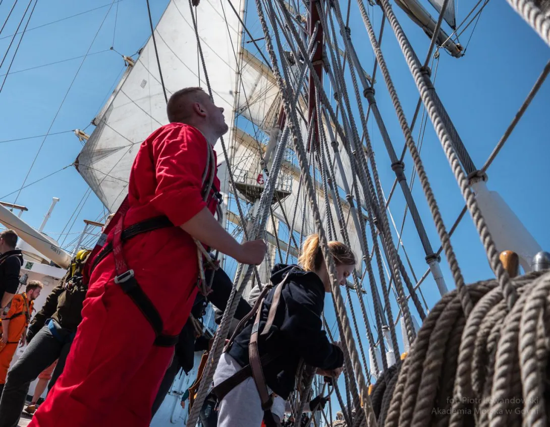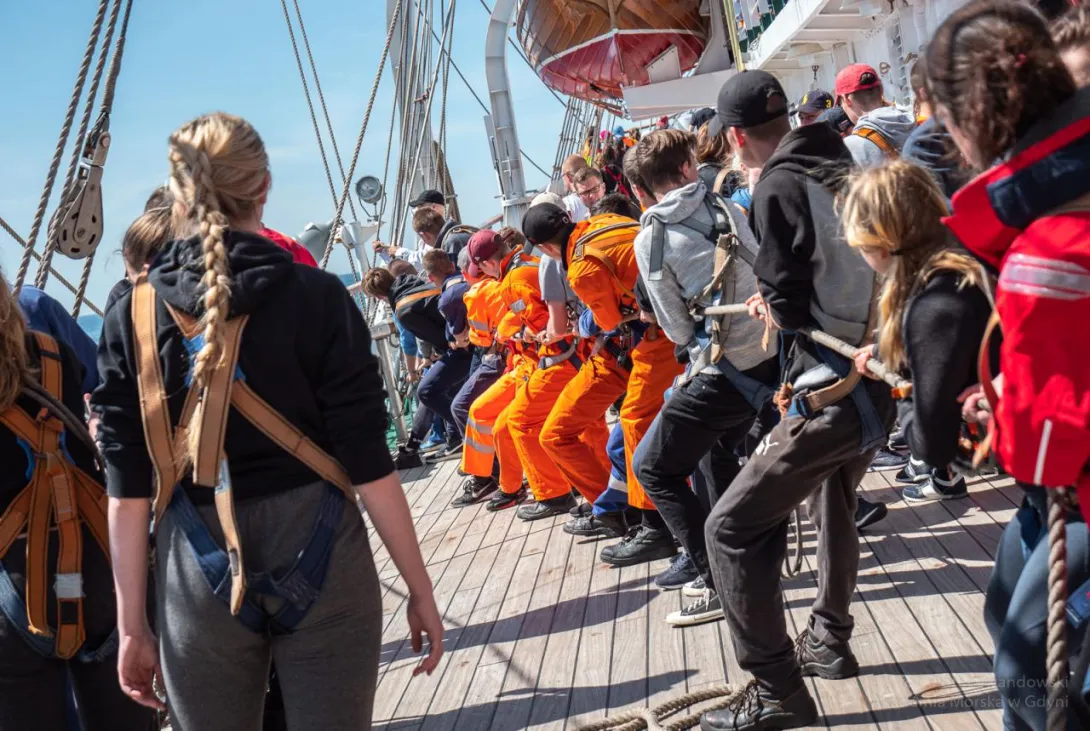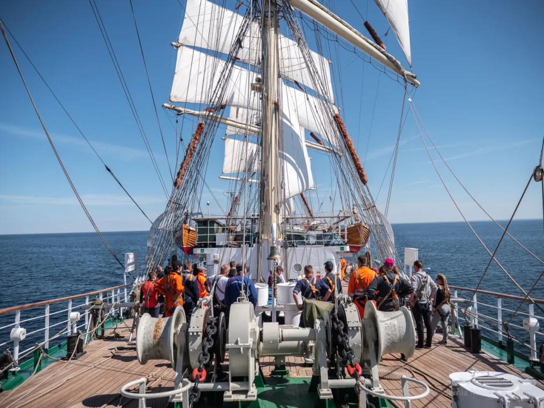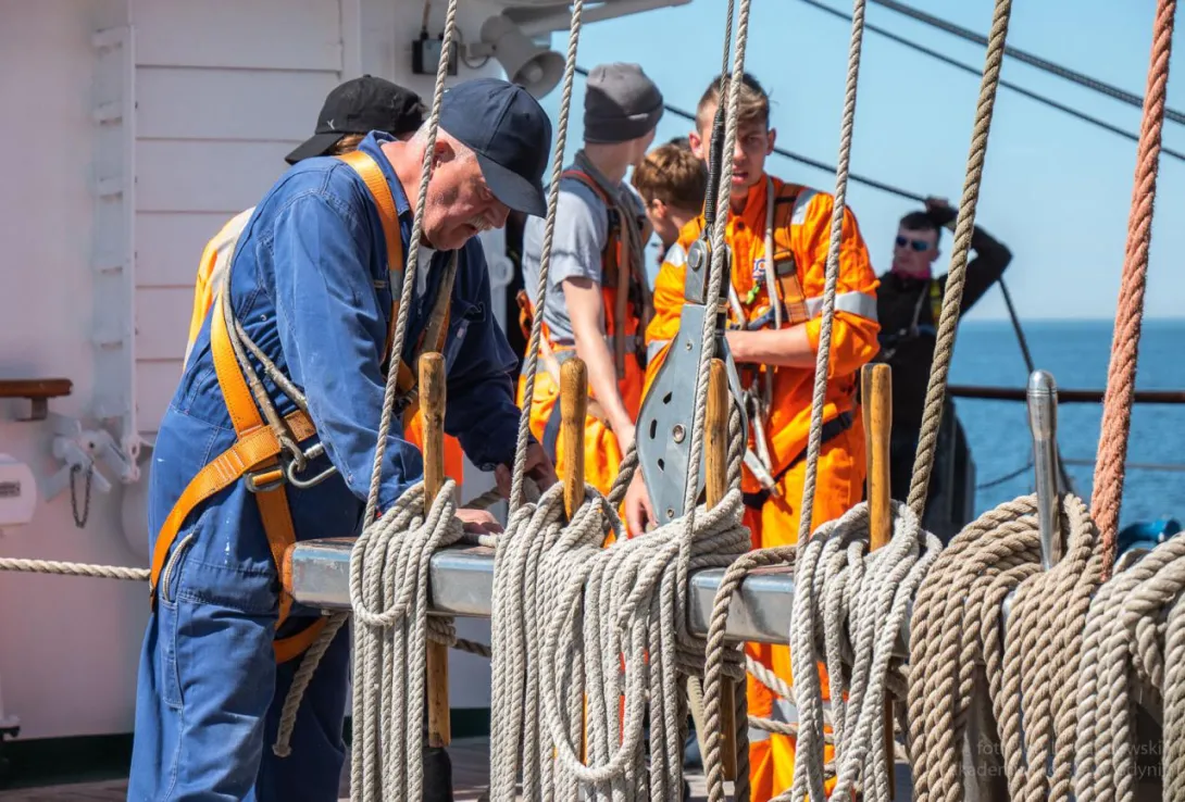 Po słonecznym pożegnaniu z Gdynią, podobną pogodą powitał nas Bałtyk. Słonecznie i bezwietrznie. Rzadko można o tym czasie spotkać tak spokojne morze. Zatem proces oswajania się z morzem przebiegał bez dramatów. Młodzież z zapałem rozpoczęła szkolenie. Ćwiczono wchodzenie na maszty, brasowanie, klarowanie żagli. Praktykanci - zarówno uczniowie techników morskich ze Szczecina i Świnoujścia, jak i laureaci konkursu - uczyli się rozkładu i nazw lin. Odbyto ćwiczebny alarm opuszczenia jednostki, alarm przeciwpożarowy i alarm człowiek za burtą, podczas którego chętni pływali wokół statku szalupą. Równocześnie młodzież pełniła wachty, podczas których wykonywała rutynowe prace konserwacyjne i pełniła służbę na mostku. Tęskniliśmy jedynie za wiatrem, który pojawił się w chwili gdy byliśmy ... na podejściu do Tallina!
