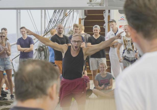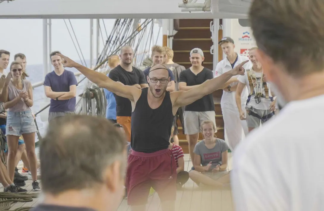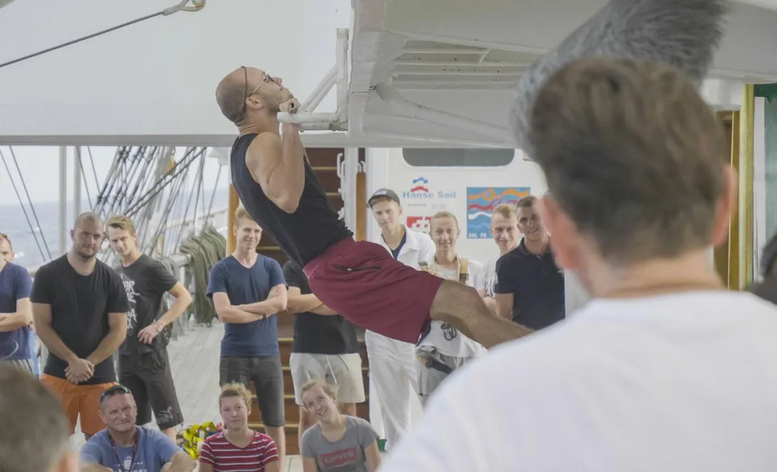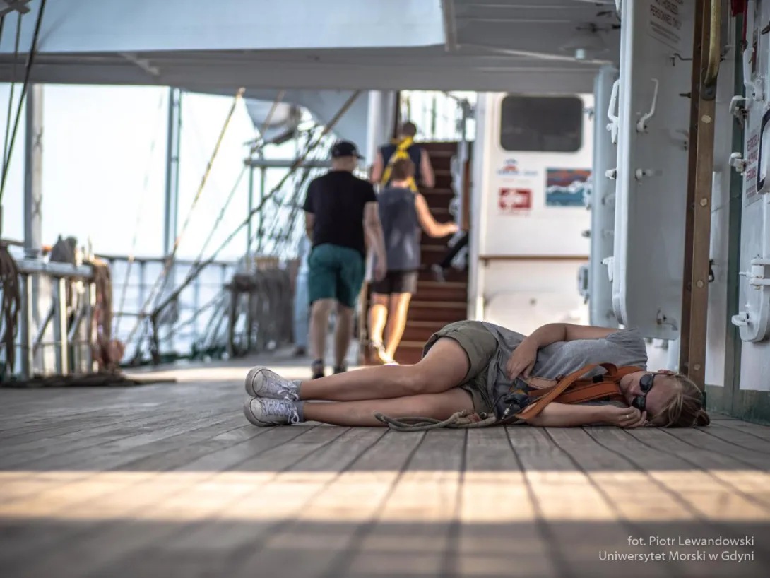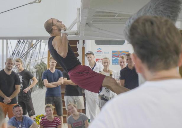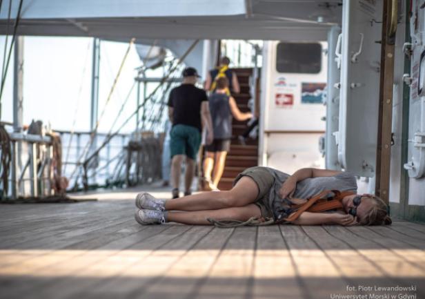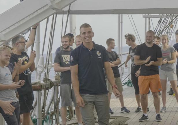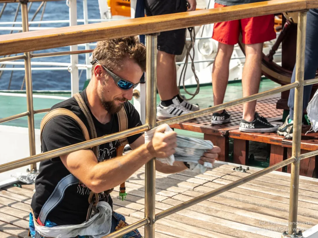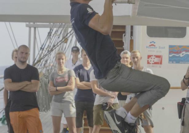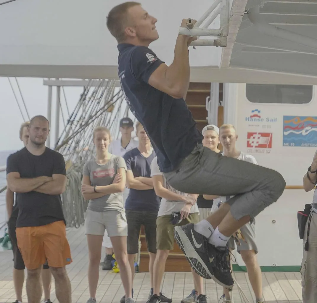 Dzisiaj odbył się finał Pierwszych Pełnomorskich Mistrzostw Świata w Podnoszeniu Nachwytem na Drążku. Mistrzem w kategorii praktykanci – mężczyźni został Łukasz Zagulski (laureat, absolwent polonistyki na UG) - 26 podciągnięć, wśród pań królowała Kamila Stapf (laureatka, studentka fizjoterapii na UML) – 5 podciągnięć, a wśród załogi bezkonkurencyjny był Michał Gondko instruktor I wachty – 16 podciągnięć.