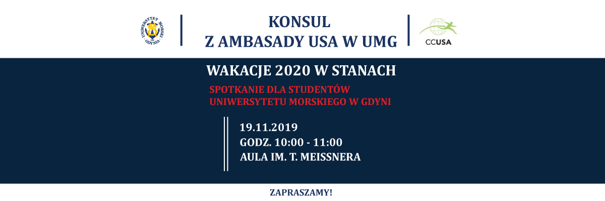 Ambasada Stanów Zjednoczonych w Warszawie, Camp Counselors USA-Poland - partner Departamentu Stanu oraz Uniwersytet Morski w Gdyni zapraszają na spotkanie z dyplomatą - przedstawicielem Ambasady USA w Polsce.