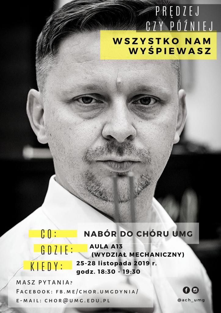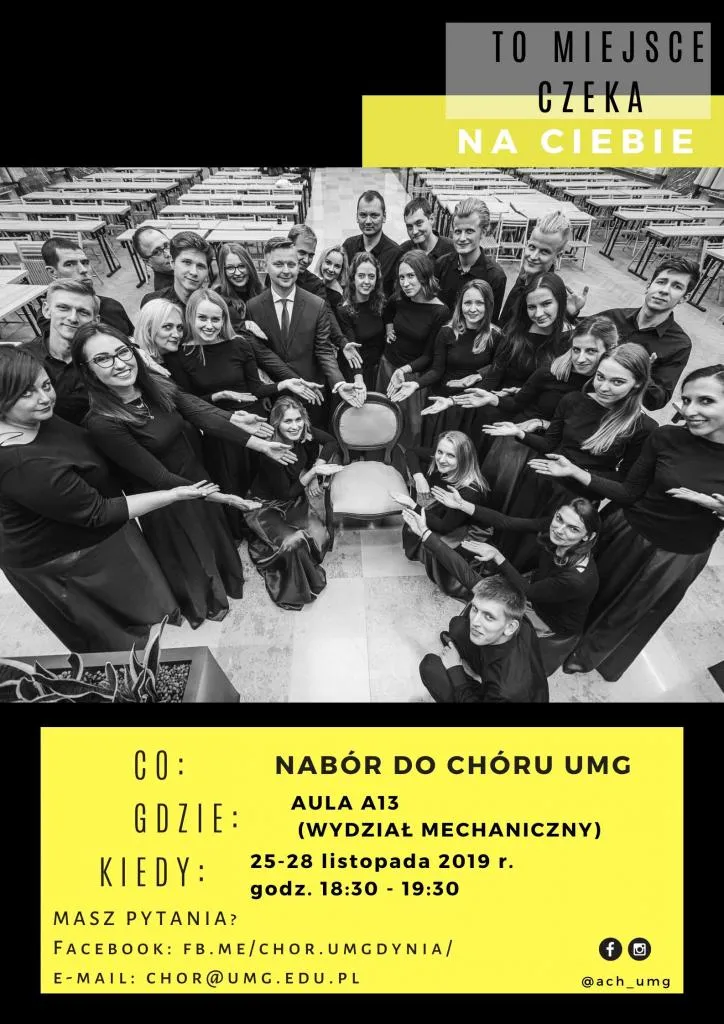 W dniach 25 - 28.11.2019 w godzinach 18:30 - 19:30 w sali A13 na Wydziale Mechanicznym będzie trwał nabór do Akademickiego Chóru Uniwersytetu Morskiego w Gdyni. Wszystkich pasjonatów śpiewania serdecznie zapraszamy!