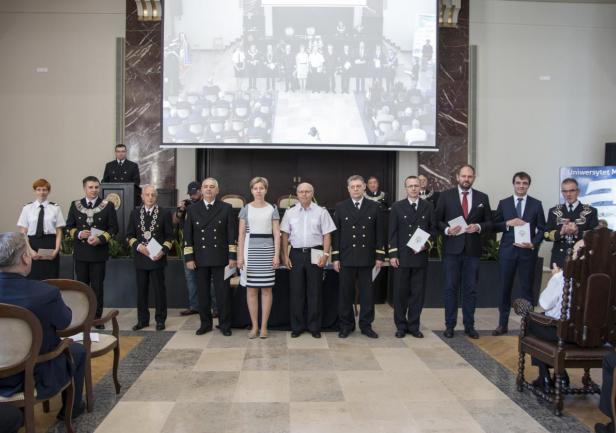 W trakcie uroczystego posiedzenia Senatu JM Rektor wraz z Szefem Wydziału Mobilizacji i Uzupełnień Wojewódzkiego Sztabu Wojskowego, ppłk. Pawłem Górskim i ppor.mar. Krzysztofem Geblerem z Wojskowej Komendy Uzupełnień w Gdyni wręczyli zaświadczenia studentom, którzy ukończyli szkolenie teoretyczne Legii Akademickiej oraz podziękowania dla osób, które te szkolenie przeprowadzili. Legia Akademicka to pilotażowy program ochotniczego szkolenia wojskowego studentów realizowany przez Ministerstwo Obrony Narodowej. Uniwersytet Morski w Gdyni przystąpił do programu przygotowując, przede wszystkim studentów UMG, do szkolenia w wybranych jednostkach wojskowych.
