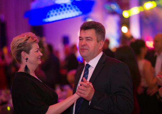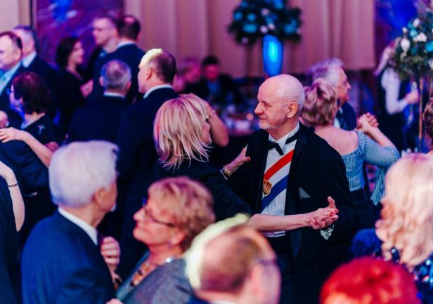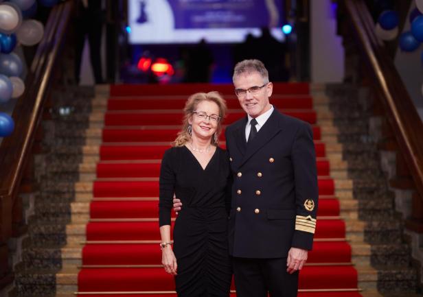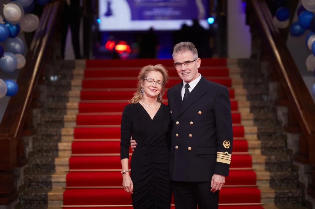 Przybyłych na bal gości witał JM Rektor UMG prof. Janusz Zarębski wraz z małżonką zapraszając do wspólnego, pamiątkowego zdjęcia na tle specjalnie wykonanej z tej okazji marynistycznej ścianki.