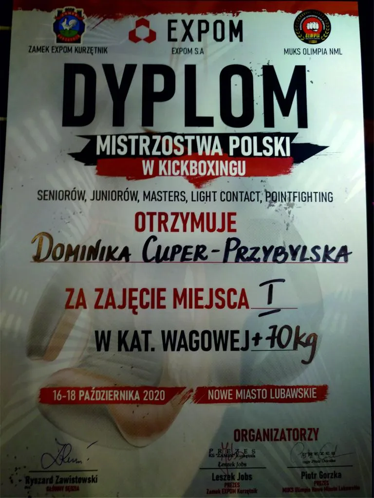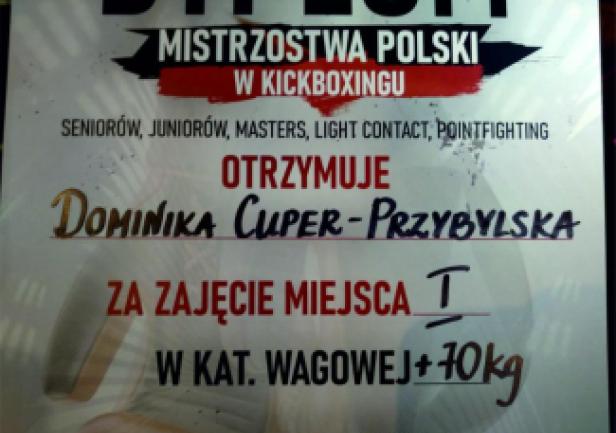 W Mistrzostwach Polski w Kickboxingu Juniorów, Seniorów i Masters w Formułach Light Contact/Pointfighting, które odbyły się w dniach 16-18.10.2020r. w Nowym Mieście Lubawskim wzięła udział Dominika Cuper-Przybylska – pracownik WE (KEO) UMG, która w formule Pointfighting zajęła trzecie miejsce a w formule Light Concat wywalczyła mistrzostwo Polski.
