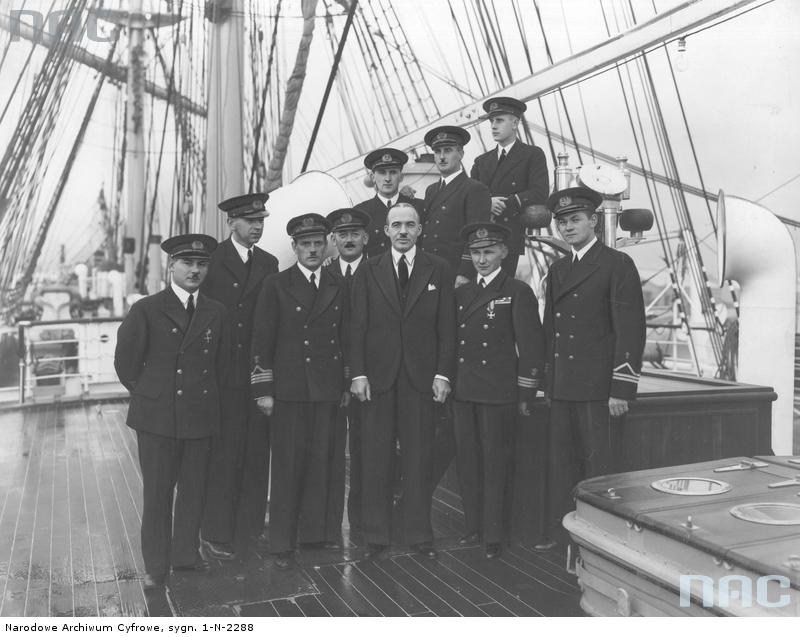Poseł nadzwyczajny i minister pełnomocny Polski w Japonii Michał Mościcki w otoczeniu oficerów na pokładzie "Daru Pomorza". Stoją od lewej: IV oficer Stanisław Kosko, lekarz dr Jarosław Truszkowski, kapitan statku Konstanty Maciejewicz, radiotelegrafista Alojzy Kwiatkowski, minister Michał Mościcki, I oficer Tadeusz Meissner, kapelan ks. Wojciech Główczewski. Stoją za nimi od lewej: III oficer Stanisław Rowiński, II oficer Konstanty Kowalski, V oficer Stefan Gorazdowski.