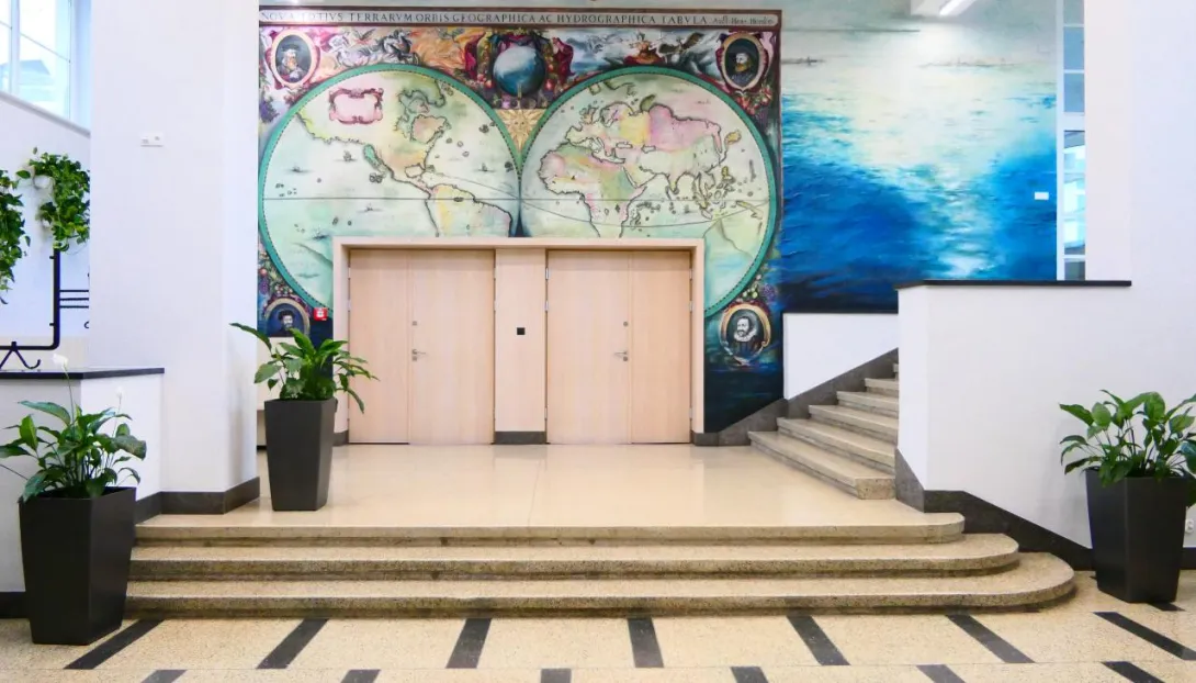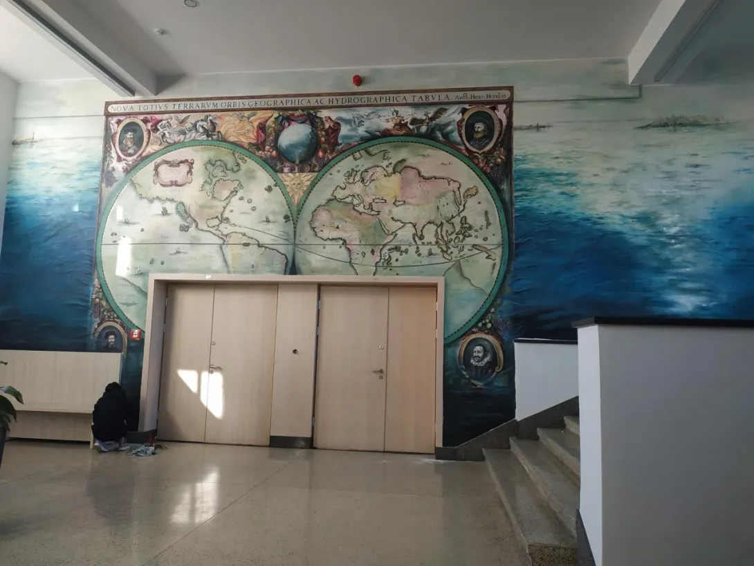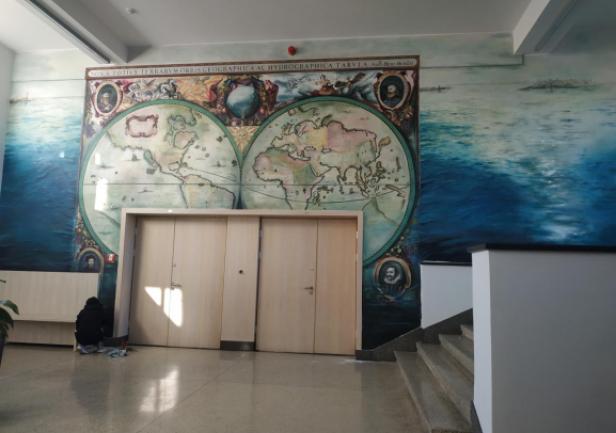 Mural, który zdobi ścianę budynku Wydziału Nawigacyjnego jest artystyczną formą pokazania Mapy Świata. Autorka dzieła, Joanna Rogowska inspirację czerpała z mapy świata opracowanej w 1630 roku przez Hendrika Hondiusa, opublikowanej rok później w atlasie Atlantis Marioris Appendix.