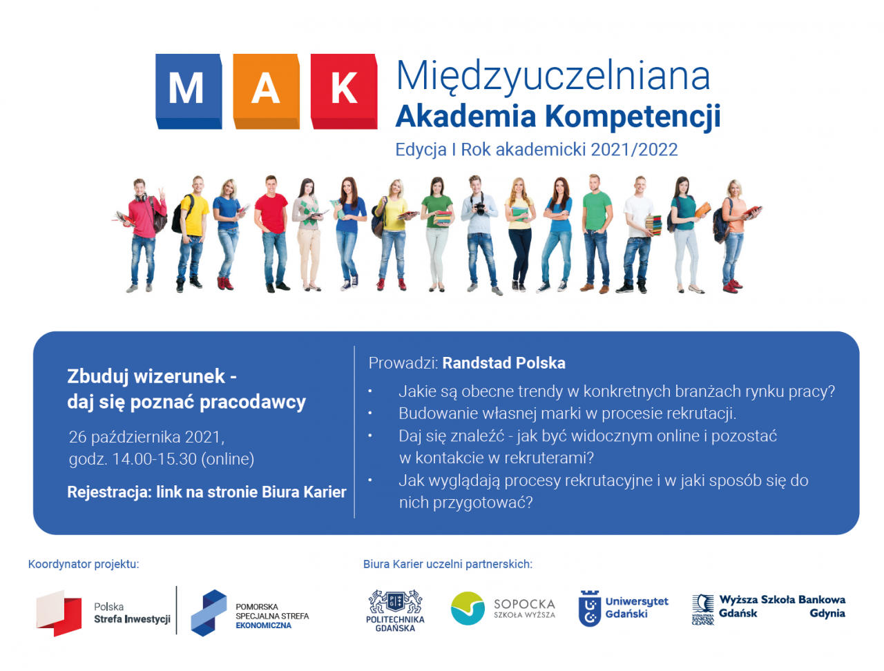 Weź udział w warsztatach „Kompetencje dla rynku pracy" w ramach projektu Międzyuczelnianej Akademii Kompetencji, realizowanego przez Pomorską Specjalną Strefę Ekonomiczną oraz biura karier 4 pomorskich uczelni i uzyskaj certyfikat uczestnictwa! „Kompetencje dla rynku pracy” to cykl warsztatów przygotowanych z myślą o studentach stawiających pierwsze kroki na ryku pracy.