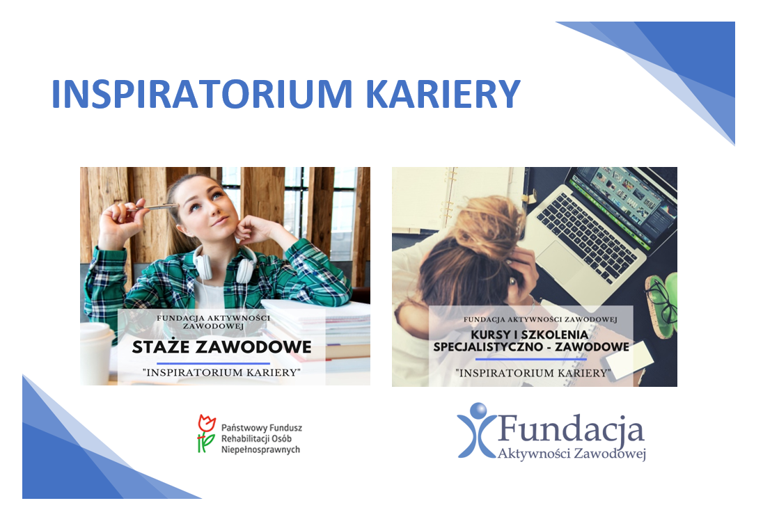 INSPIRATORIUM KARIERY to projekt realizowany przez Fundację Aktywności Zawodowej ze środków PFRON w ramach konkursu ABSOLWENT. Skierowany jest do niezatrudnionych mieszkańców województwa pomorskiego, którzy ukończyli studia w okresie ostatnich 5 lat, bądź obecnie są studentami ostatniego/przedostatniego semestru. Więcej informacji:http://www.faz.org.pl/