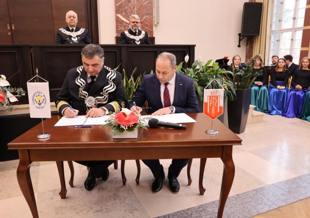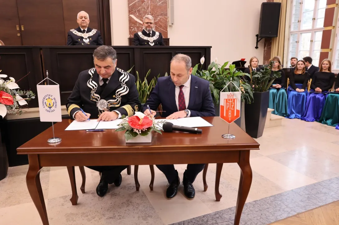 W dalszej części uroczystości miało miejsce podpisanie umowy o współpracy między Uniwersytetem Morskim w Gdyni a Polską Żeglugą Bałtycką. Dokument podpisali: z ramienia Uczelni JM Rektor prof. dr hab. inż. kpt. ż.w. Adam Weintrit oraz z ramienia Polskiej Żeglugi Bałtyckiej prezes spółki Andrzej Madejski.
