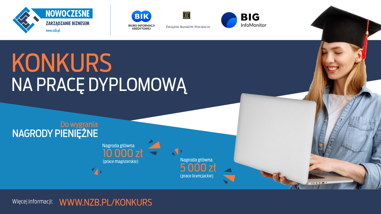 Konkurs na najlepsze prace licencjackie i magisterskieCentrum Prawa Bankowego i Informacji - organizator Programu Nowoczesne Zarządzanie Biznesem, który powstał z inicjatywy Związku Banków Polskich i Grupy BIK - zaprasza autorów lub promotorów do zgłaszania prac licencjackich i magisterskich do konkursu z wysokimi nagrodami pieniężnymi.