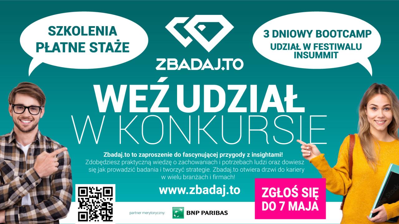 Zbadaj.to to zaproszenie do fascynującej przygody z insightami! Dzięki udziałowi w konkursie zdobędziesz praktyczną wiedzę o zachowaniach i potrzebach ludzi oraz dowiesz się jak prowadzić badania i tworzyć strategie. To bardzo poszukiwane kompetencje, niezbędne w wielu zawodach i branżach. Finałowy Boot Camp zbadaj.to z udziałem doświadczonych praktyków biznesu to prawdziwy booster Twojej kariery i networkingu! W 2023 partnerem konkursu jest Bank BNP Paribas…