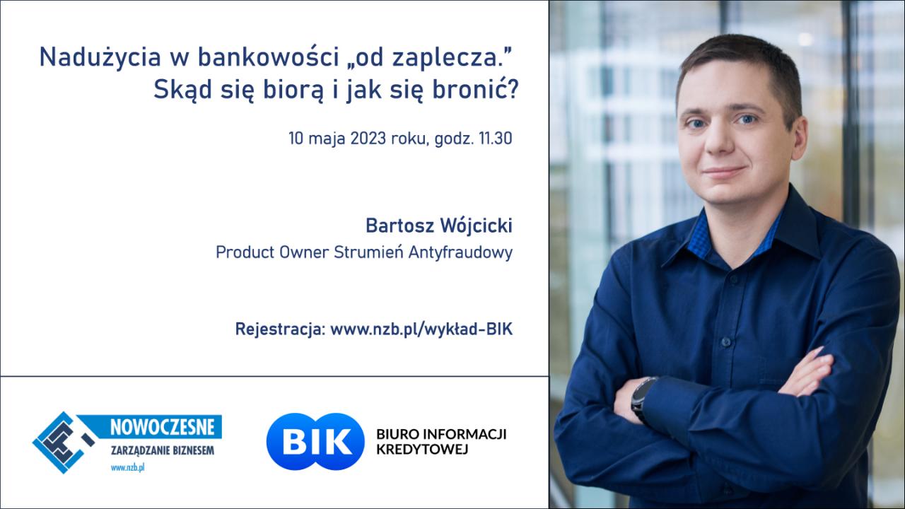 zapraszamy do udziału w ogólnopolskim wykładzie online Bartosza Wójcickiego, Dyrektora Biura Usług Antyfraudowych BIK pt.: „Nadużycia w bankowości „od zaplecza". Skąd się biorą i jak się bronić?”.