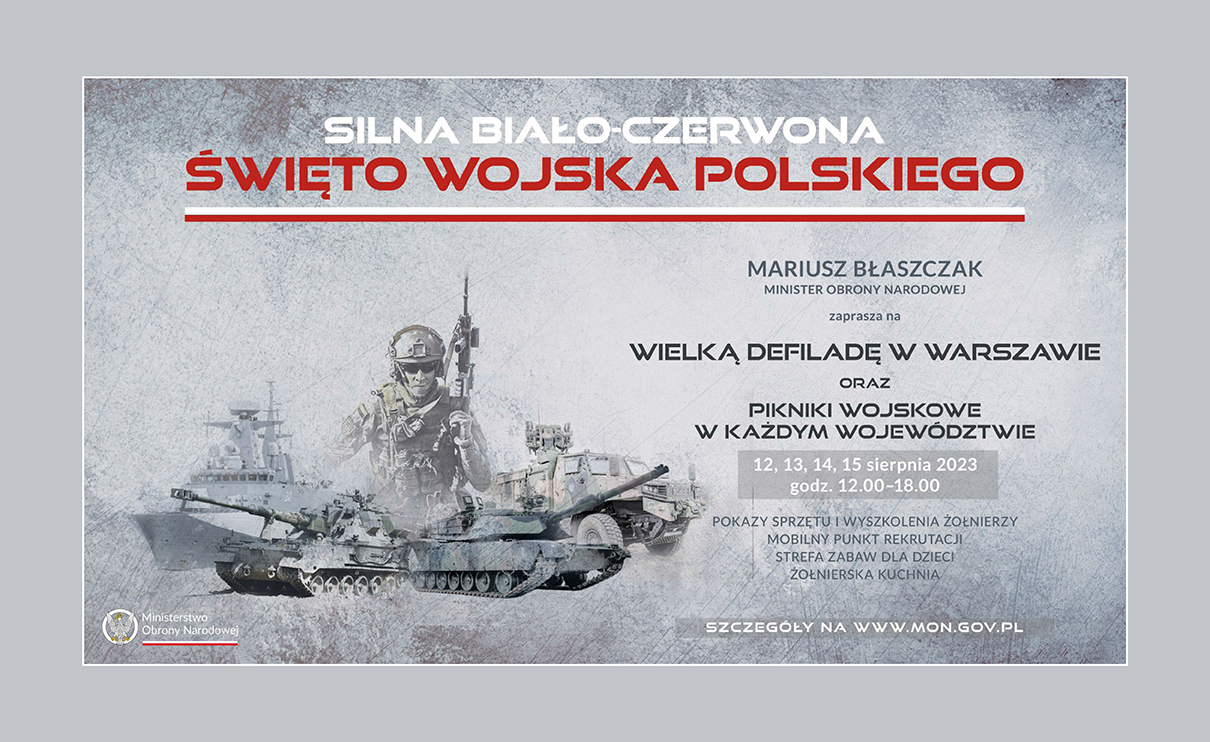 SILNA BIAŁO-CZERWONA – pod takim hasłem w dniach 12-15 sierpnia odbędą się tegoroczne obchody Święta Wojska Polskiego. Najważniejszym wydarzeniem będzie wielka defilada Wojska Polskiego w Warszawie. W całym kraju odbędą się pikniki wojskowe. 15 sierpnia to szczególna data nie tylko dla żołnierzy, ale również dla wszystkich Polaków. Tego dnia obchodzimy Święto Wojska Polskiego, ustanowione na pamiątkę zwycięskiej nad bolszewikami Bitwy Warszawskiej z 1920 roku, która na kartach historii zapisała się jako "Cud nad Wisłą". Po 3 latach powraca największa defilada Wojska Polskiego, która 15 sierpnia wyruszy o godz. 14.00 na warszawskiej Wisłostradzie. W całym kraju odbędzie się blisko 70 pikników wojskowych, podczas których prezentowane będzie indywidualne wyposażenie żołnierza oraz sprzęt wojskowy będący na wyposażeniu Wojska Polskiego.