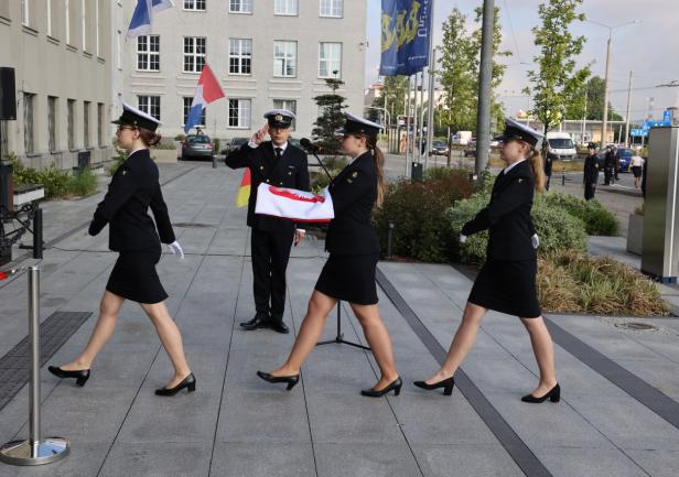 Uroczystość obchodów Święta Szkoły UMG rozpoczęła się o godzinie 8:00 tradycyjnym podniesieniem biało-czerwonej bandery Polskiej Marynarki Handlowej na gmachu głównym Uniwersytetu.