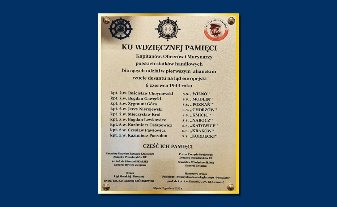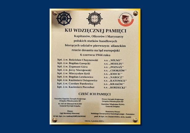 Tablice podzielono na trzy grupy tematyczne. Pierwsza z nich ma przypominać o kapitanach, oficerach i marynarzach polskich statków handlowych, którzy wzięli udział w pierwszej, alianckiej operacji desantowej w dniu 6 czerwca 1944 roku. Na tej tablicy znalazły się nazwiska: Rościsława Choynowskiego, Bogdana Gawęckiego, Zygmunta Góry, Jerzego Nierojewskiego, Mieczysława Króla, Bohdana Lewkowicza, Kazimierza Ostapowicza, Czesława Pawłowskiego i Kazimierza Poczobuta.