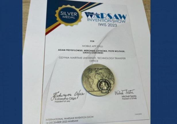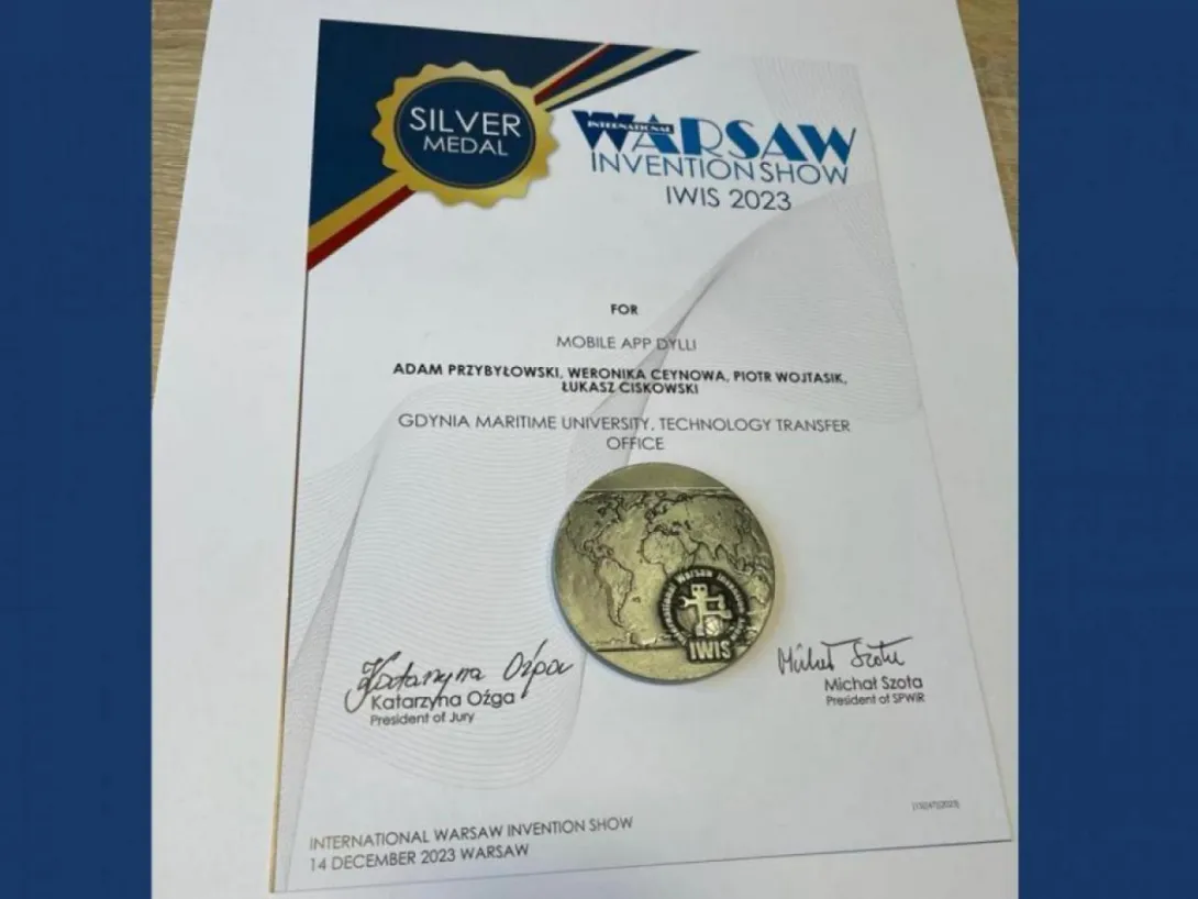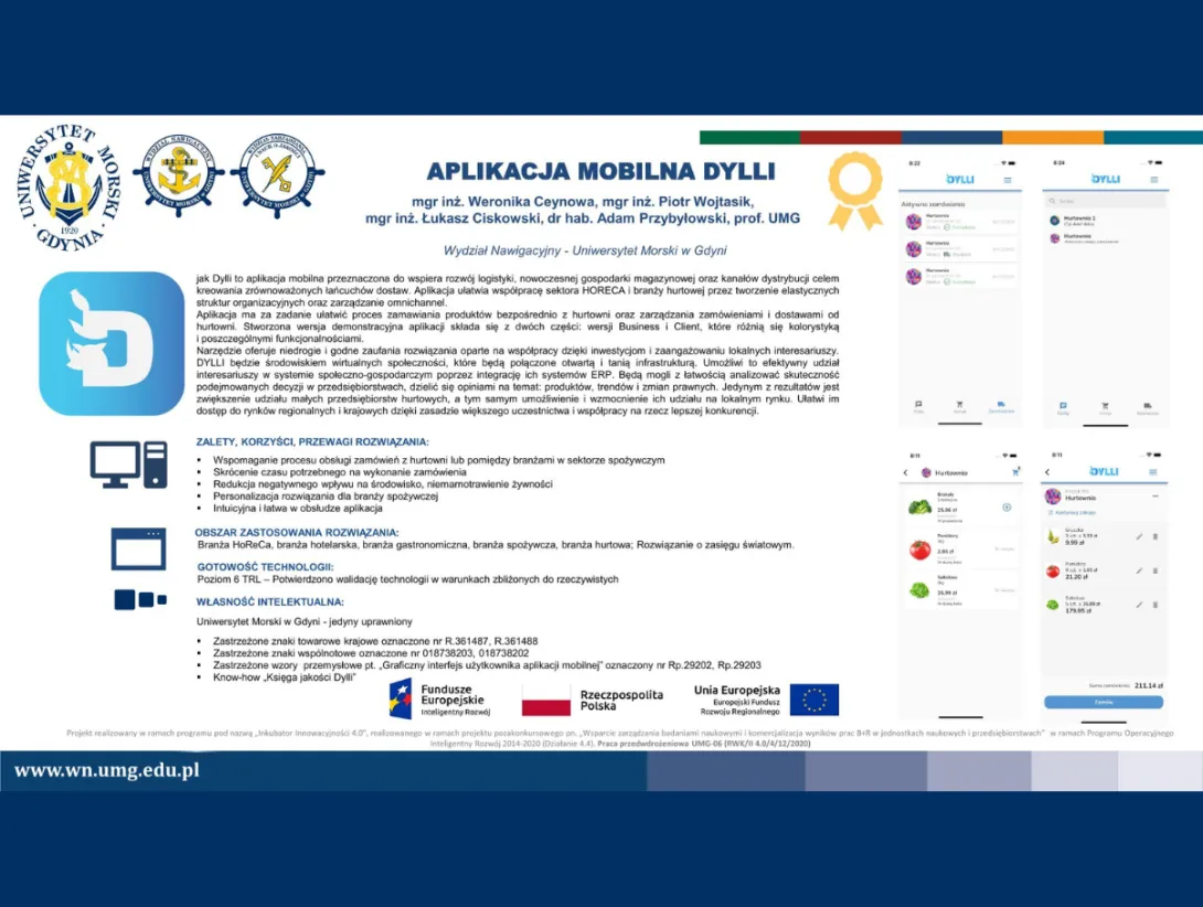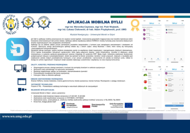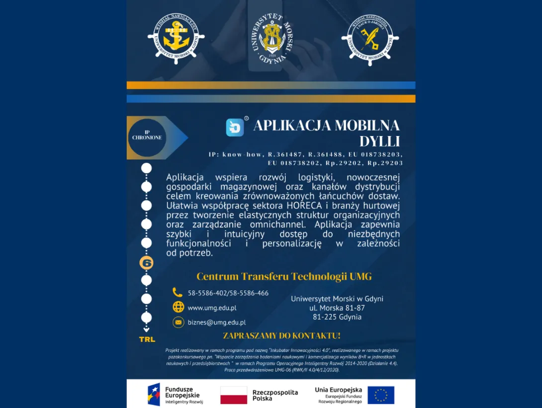 Usunięto obraz.Prototyp chronionej aplikacji mobilnej wraz z know-how oraz logotypem Dylli został opracowany oraz zgłoszony do ochrony w ramach realizacji pracy przedwdrożeniowej UMG-06 (RWK/II 4.0/4/12/2020) w programie pod nazwą “Inkubator Innowacyjności 4.0”, realizowanym w ramach projektu pozakonkursowego pn. “Wsparcie zarządzania badaniami naukowymi i komercjalizacja wyników B+R w jednostkach naukowych i przedsiębiorstwach” w ramach Programu Operacyjnego Inteligentny Rozwój 2014-2020 (Działanie 4.4). Innowacyjne rozwiązanie zostało w grudniu 2023 r. nagrodzone srebrnym medalem na Międzynarodowej Warszawskiej Wystawie Wynalazków IWIS i wchodzi w zakres portfela debiutującego oferty technologicznej należącej do Uczelni.