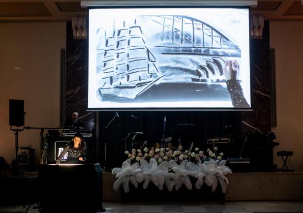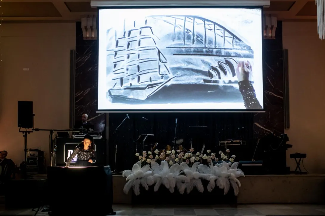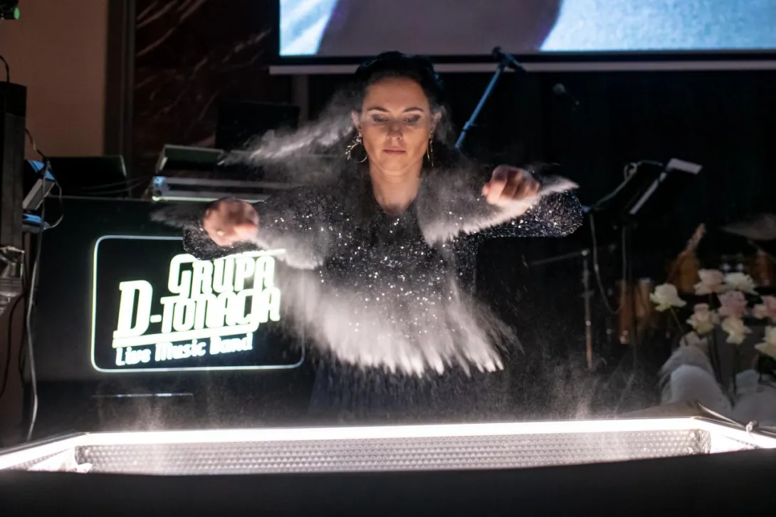 Niespodzianką wieczoru był imponujący pokaz Magdaleny Suszek-Bąk malującej solą na żywo. Artystka w swoich pokazie przedstawiła historię Uniwersytetu oraz Gdyni rysując dłońmi obrazy za pomocą specjalnej soli.