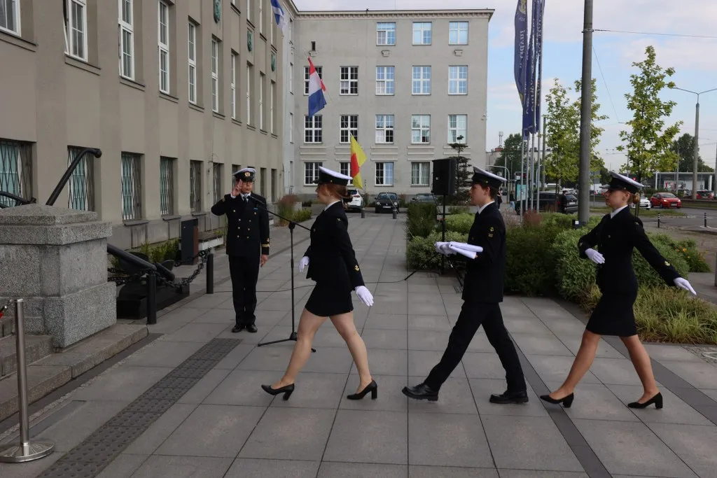 Biało-czerwona bandera Polskiej Marynarki Handlowej została podniesiona na gmachu głównym Uniwersytetu punktualnie o godzinie 8:00.
