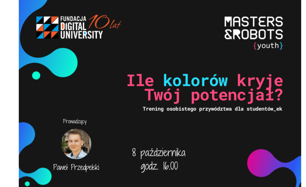 Warsztaty są organizowane w ramach konferencji Masters&Robots Youth. Już 25 października 2024 r. odbędzie się kolejna edycja tego niezwykłego wydarzenia. To bezpłatna konferencja online skierowana do uczniów szkół ponadpodstawowych i studentów, stojących przed ważnymi decyzjami dotyczącymi kariery zawodowej. Masters&Robots Youth pomaga zrozumieć, jakie kompetencje będą pożądane na rynku pracy i się do nich przygotować, aby zyskać przewagę konkurencyjną. Organizatorem konferencji jest Fundacja Digital University, która od 10 lat wspiera ludzi w przygotowaniu się na wyzwania przyszłości.