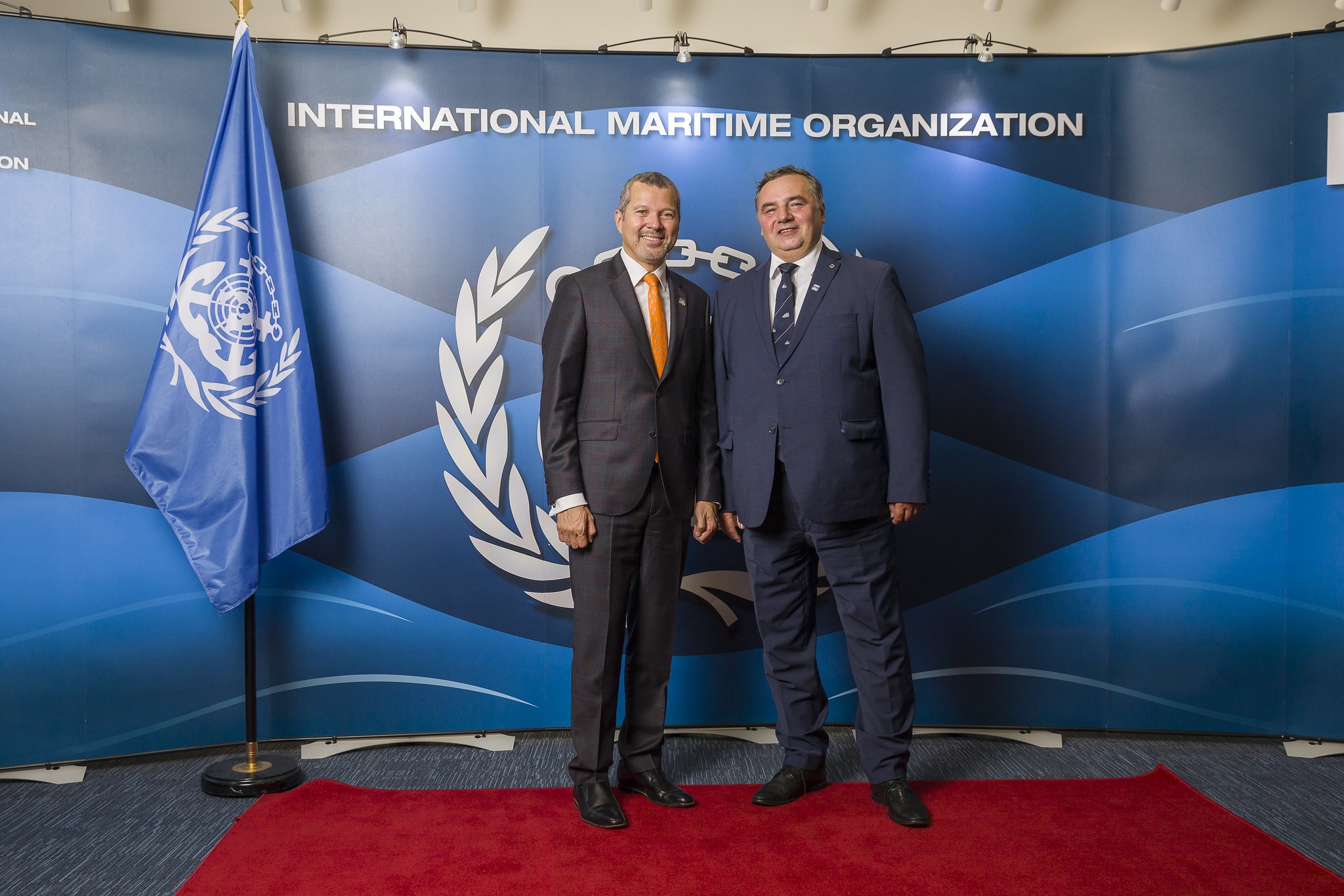 Sekretarz Generalny Międzynarodowej Organizacji Morskiej IMO, Arsenio Dominguez wraz z JM Rektorem Uniwersytetu Morskiego w Gdyni prof. dr. hab. inż. kpt. ż.w. Adamem Weintritem podczas obchodów Światowego Dnia Morza 2024 w Londynie. Fot. www.imo.org
