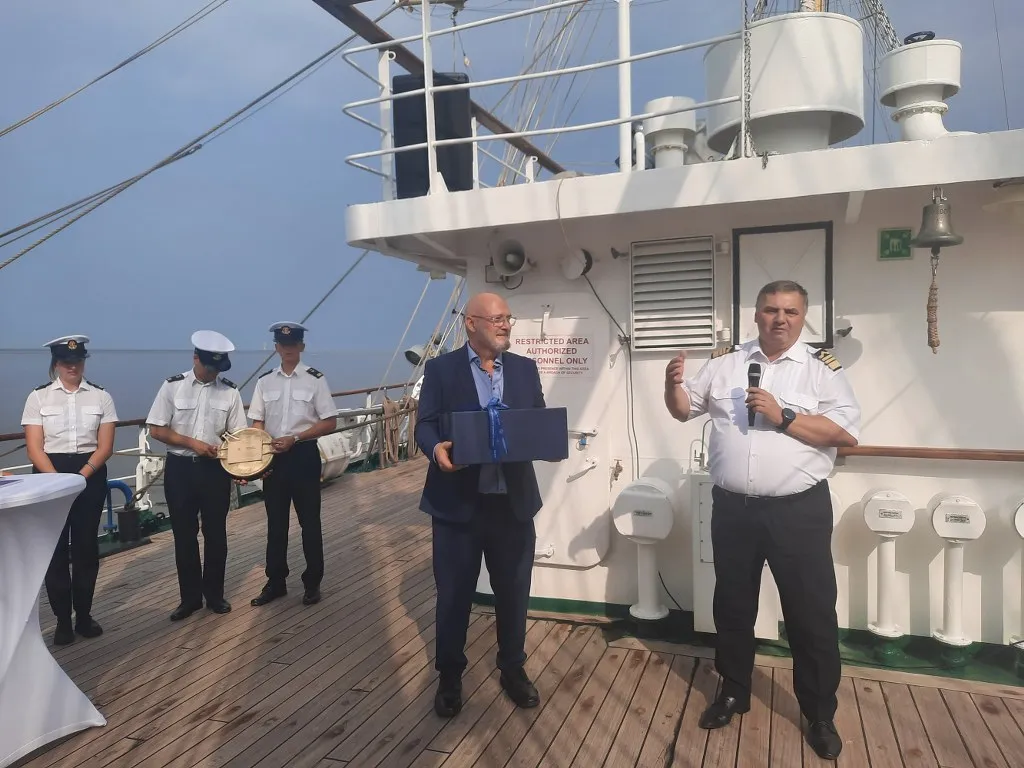 Następnie na ręce Rektora Hochschule Bremerhaven prof. Alexisa Papathanassisa JM Rektor prof. dr hab. inż. kpt. ż.w. Adam Weintrit na pamiątkę obchodów wręczył oryginalny bulaj z pokładu „Daru Młodzieży” oraz komplet porcelanowej zastawy według wzoru używanego na „Darze Młodzieży”.