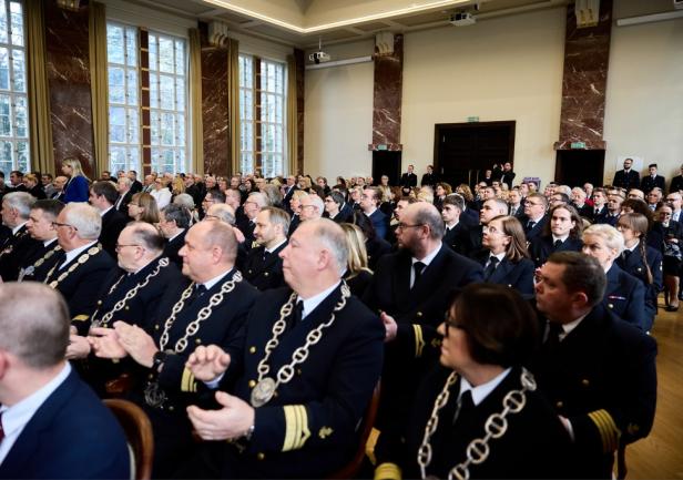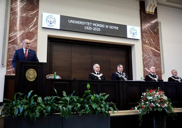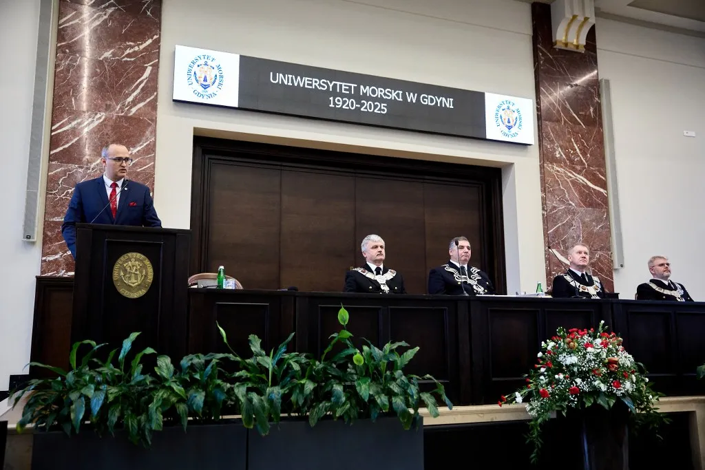 JM Rektor prof. Adam Weintrit zwrócił uwagę słuchaczy, iż rok 2025 obfitował w zawieranie, a także pogłębianie dotychczasowych współprac krajowych i zagranicznych, umacniając tym samym pozycję Uczelni w międzynarodowym środowisku morskim, skupiającym zarówno ludzi biznesu, jak i nauki: