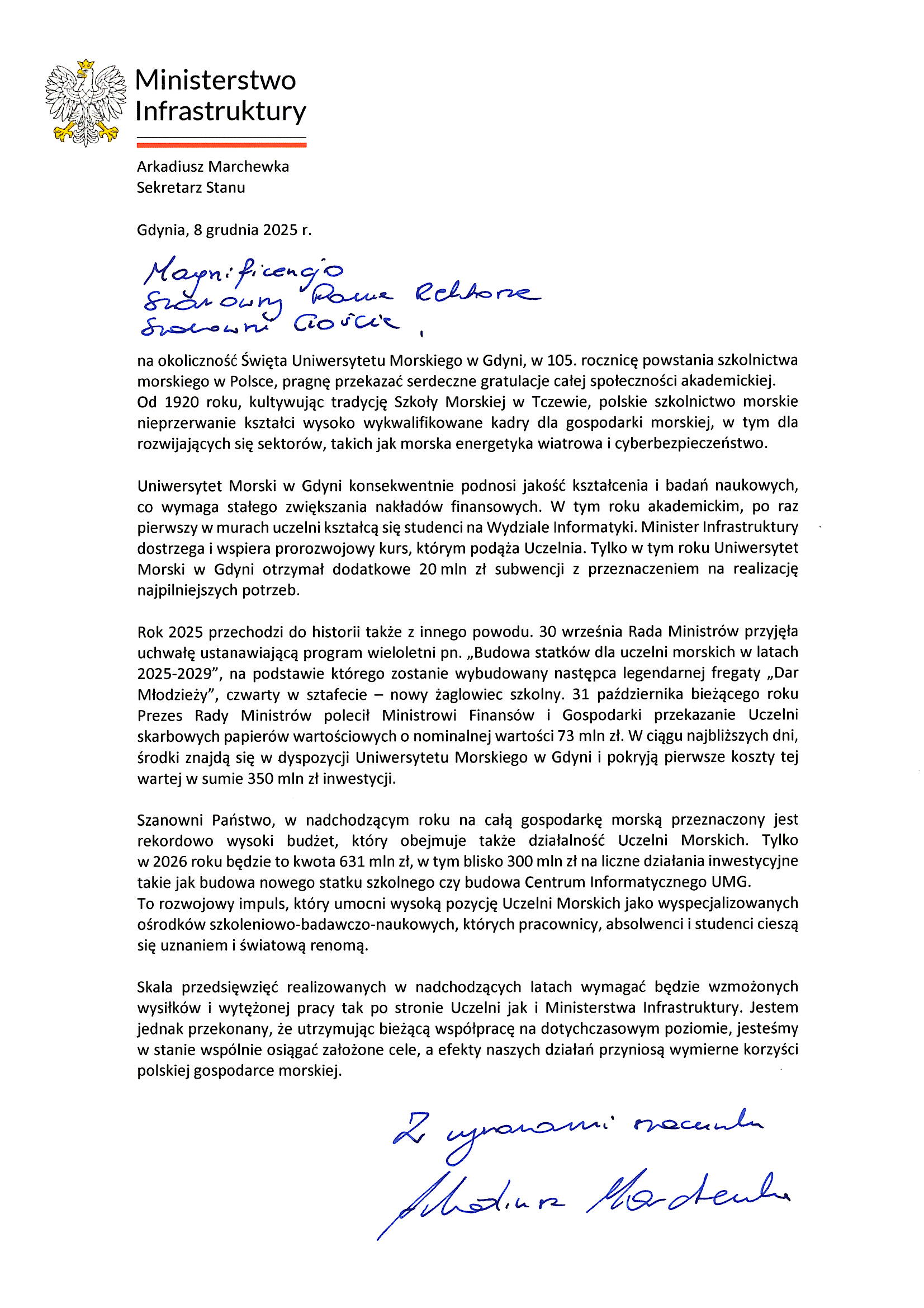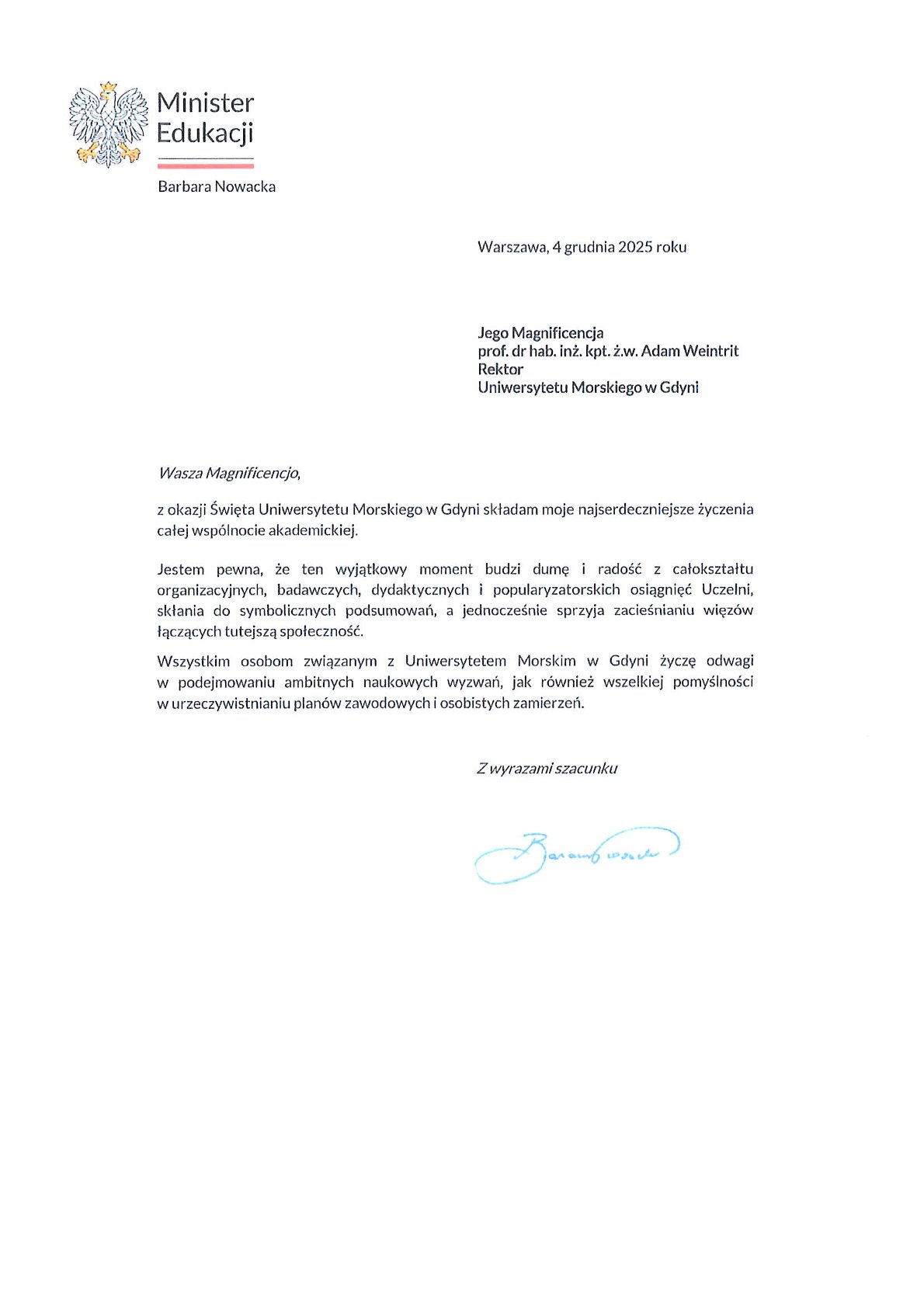 W trakcie uroczystości Mistrz Ceremonii, Aleksander Gosk odczytał również list okolicznościowy nadesłany przez Minister Edukacji, Barbarę Nowacką, która, składając wspólnocie akademickiej Uniwersytetu Morskiego w Gdyni życzenia z okazji Święta Szkoły, zapewniła: