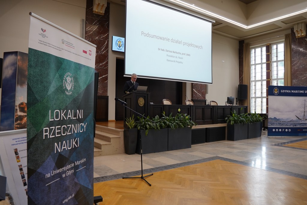 W pierwszej części uroczystości dokonano podsumowania projektu, które przedstawił kierownik projektu – dr hab. Dariusz Barbucha, prof. UMG, Prorektor ds. Nauki. Charakteryzując, projekt wskazał: „Projekt „Lokalni Rzecznicy Nauki na Uniwersytecie Morskim w Gdyni” to, w moim przekonaniu, głęboko przemyślany projekt. Z jednej strony, naszym celem było wyposażenie uczestników projektu w określone kompetencje, które pozwoliłyby im na skuteczne i interesujące przekazywanie wiedzy naukowej różnym grupom społecznym. Z drugiej zaś strony, założyliśmy, iż nabyte kompetencje uczestnicy projektu wykorzystają w różnorodnych działaniach przybliżających społeczeństwu w sposób popularnonaukowy wybrane zagadnienia, którymi sami zajmują się naukowo jako pracownicy UMG”.